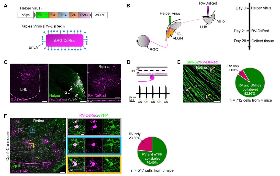 案例二:暨南大学任超然课题组在Opn4-Cre小鼠LHb脑区注射RV病毒SAD-DG-DsRed (EnvA),在vLGN/IGL区注射表达TVA和RVG的AAV辅助病毒,实现逆向跨单级突触,发现m4型mRGCs直接激活vLGN/IGL-LHb通路。(如图6)