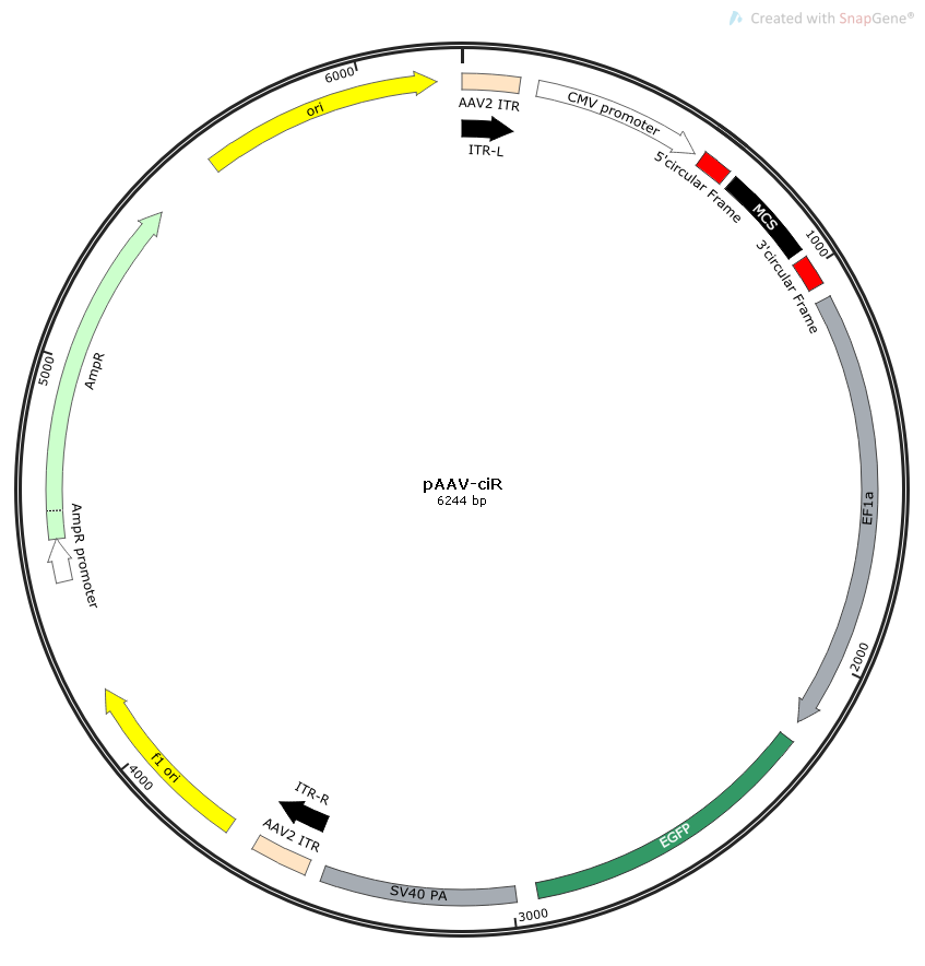 目前枢密科技提供pAAV-ciR、pLV-ciR等circRNA过表达载体构建服务,同时可选择携带各种荧光报告基因或抗性基因,适用于普通真核表达、慢病毒包装与稳转细胞系建立、腺相关病毒包装等多种用途。该系列载体均含有circRNA环化表达框架,用于克隆目标circRNA的线性序列,之后转染细胞后可通过RNA剪切形成circRNA分子。