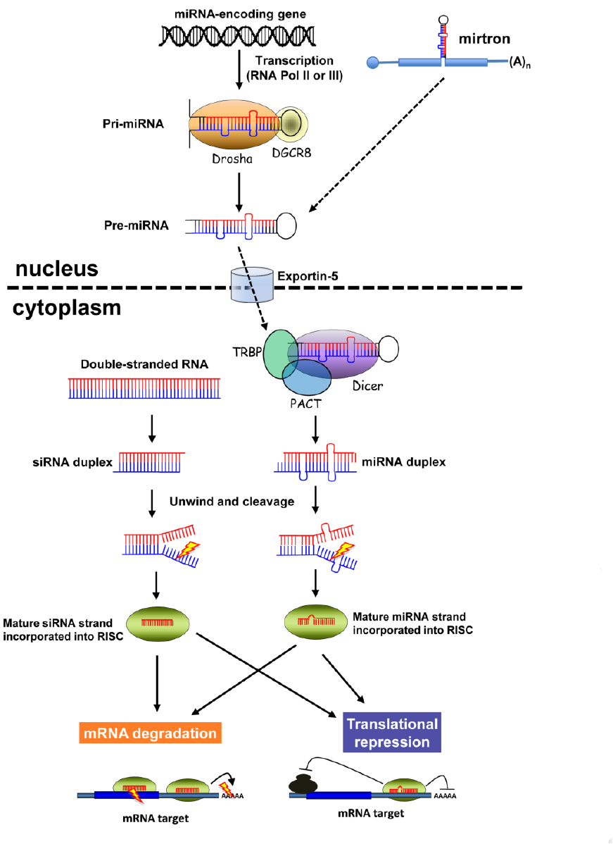 miRNA首先在细胞核内转录出较长的初级miRNA(primary miRNA,pri-miRNA),然后在核心内由Drosha加工成发夹状RNA,即前体miRNA(miRNA precusor,pre- miRNA),在Exprotin-5复合物的帮助下被转运出胞核,在胞浆中由Dicer剪切成为成熟的miRNA,随即被整合进RNA沉默复合物(RISC)中,基于与mRNA完全或不完全配对来调节基因表达。