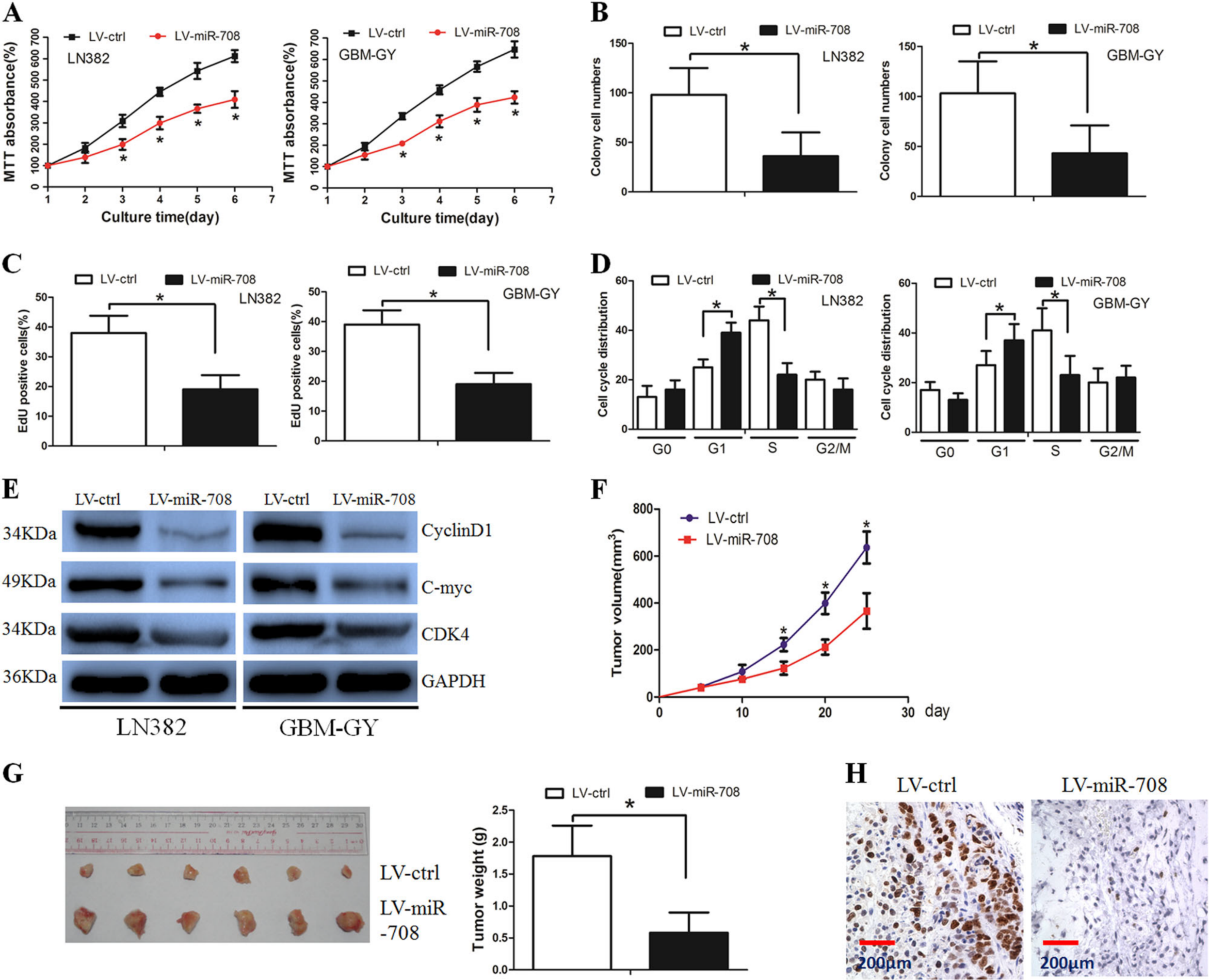 方法及结论:用LV载体介导miR-708的过表达,结合体内体外实验来验证miR-708的功能。用LV-miR-708(实验组)和LV-miRNA(对照组)分别感染胶质瘤细胞,MTT实验结果显示感染感染LV-miR-708(实验组)的细胞存活率明显比对照组低;克隆形成实验也表明实验组的单克隆数量减少;EDU实验也显示实验组的细胞增殖显著缓慢。研究者同时将细胞系种植到体内,一段时间后从小鼠体内取出异种移植瘤,瘤重量和ki-67数据表明miR-708可以抑制胶质瘤的发生。