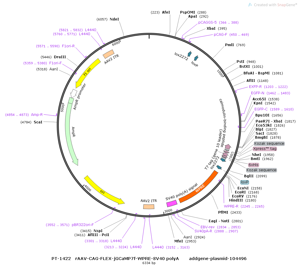 病毒用途:利用基因编码钙指示剂(genetically encoded calcium indicators,GECIs)测量神经元活动已成为神经科学中广泛使用的方法,GECIs进行钙成像通常用于测量完整神经系统的神经活动,如检测大量神经元胞体的活动,或追踪神经元亚细胞(如轴突、树突和单个突触)的动态。钙离子成像技术(Calcium imaging system)属于光遗传学技术中的一类,是利用可以感应Ca2+浓度的钙离子指示剂,检测细胞或组织中Ca2+的浓度变化,将钙浓度变化转化为荧光信号,从而使细胞电活动转化为可记录的光信号。