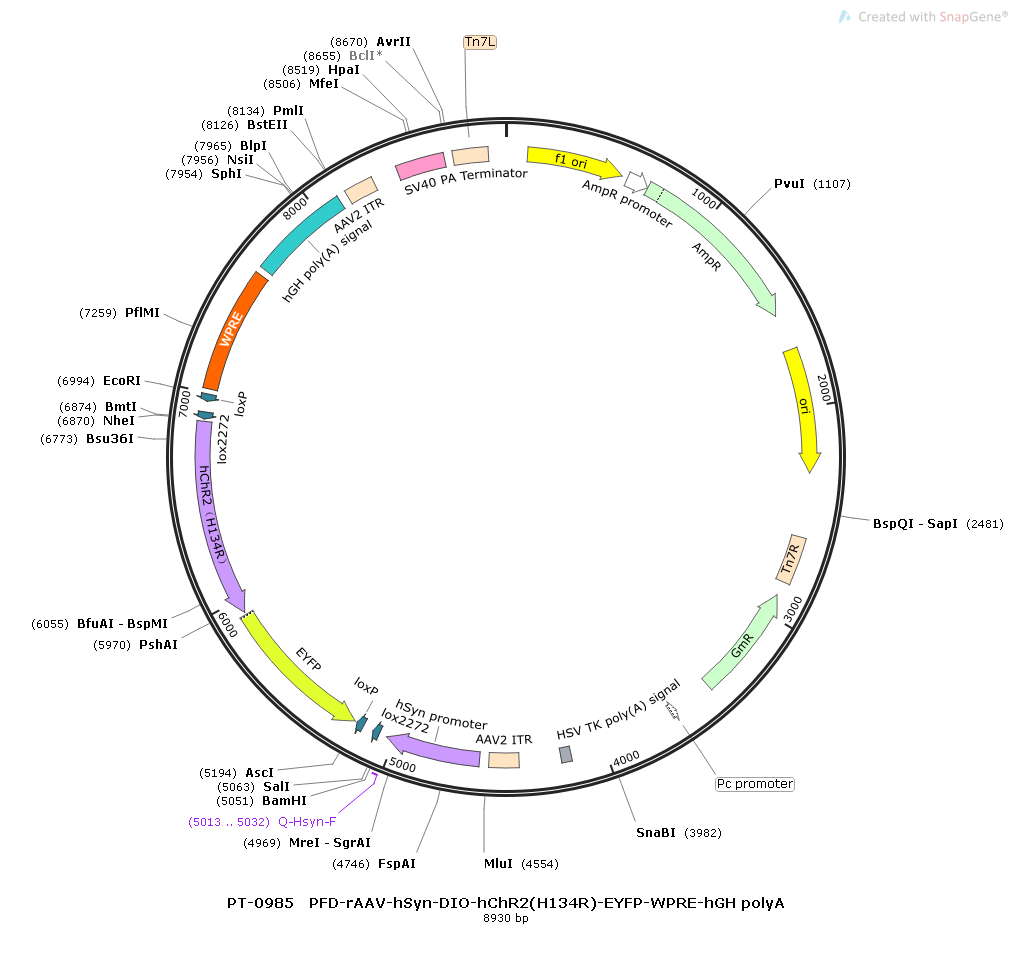 成熟神经元特异性启动子hSyn调控Cre依赖的光激活元件的表达, 在有Cre时ChR2-EYFP表达,无Cre时ChR2-EYFP不表达 |