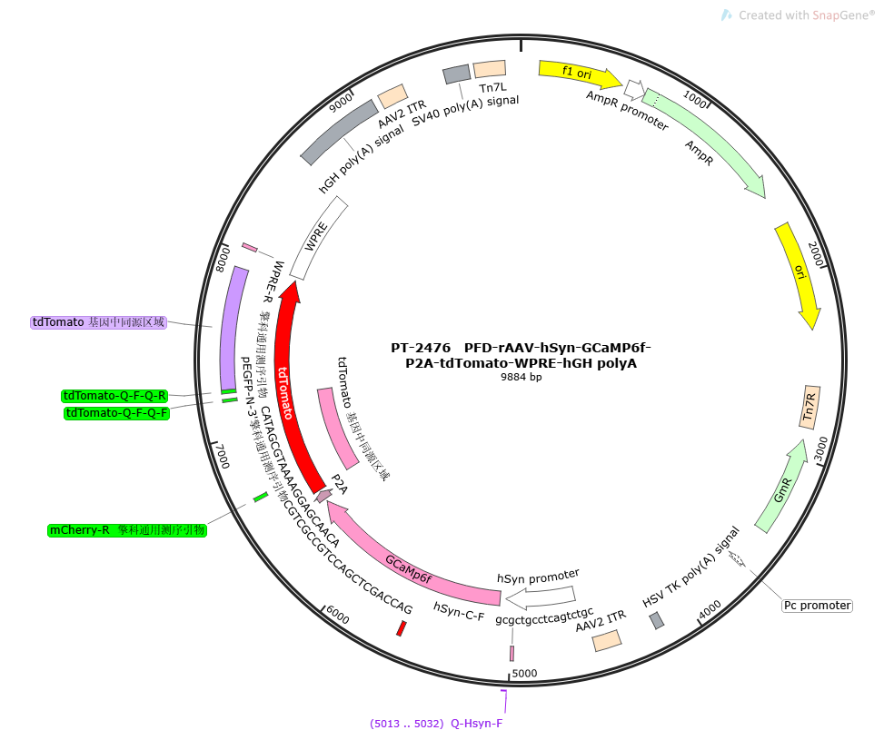 启动子:hSyn,人突触蛋白启动子,成熟神经元特异性启动子,448bp。