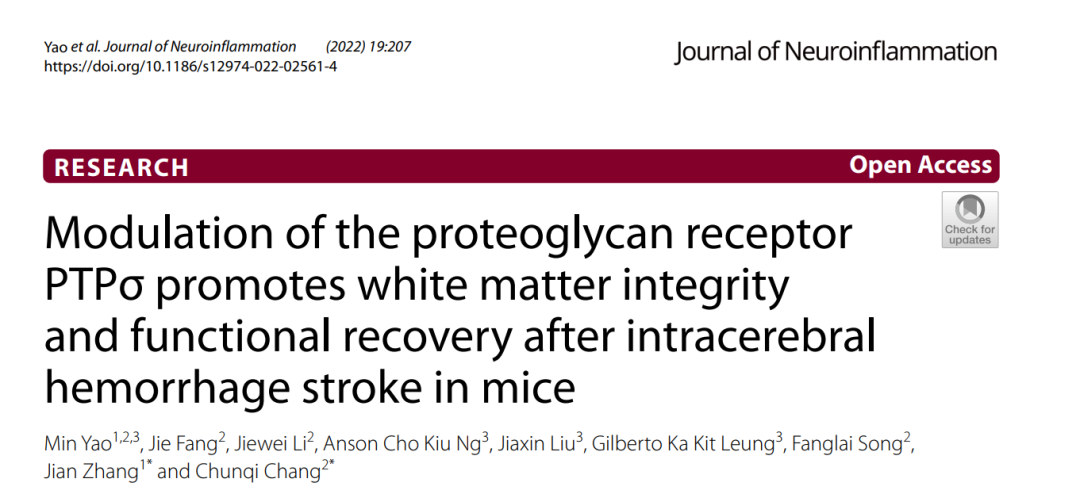2022年8月,深圳大学医学部常春起与张健团队在Journal of Neuroinflammation上发表了题为“Modulation of the proteoglycan receptor PTPσ promotes white matter integrity and functional recovery after intracerebral hemorrhage stroke in mice”的研究论文,提出ISP可通过改善血肿周围炎症反应,增加白质完整性及髓鞘再生,促进ICH后神经功能恢复。姚敏(博士,第一作者)和方杰(硕士研究生)为论文主要完成者,常春起教授和张健教授为论文通讯作者。在此项研究中,作者发现,ICH后,ISP通过靶向PTPσ调节免疫炎症,提高WM的完整性和感觉运动功能恢复。ISP给药可显著降低大脑血肿周围和颈段脊髓背侧皮质脊髓束(cortical spinal tract,CST)的WM损伤,增加轴突髓鞘形成,促进神经功能恢复。体外研究也表明ISP抑制PTPσ通过调控Erk/CREB信号通路促进髓鞘形成。此外,蛋白组学结果显示ISP结合PTPσ调控多个分子信号通路,参与ICH后的炎症和神经再生过程。该研究为治疗脑出血提供新证据,具有重要的临床意义。