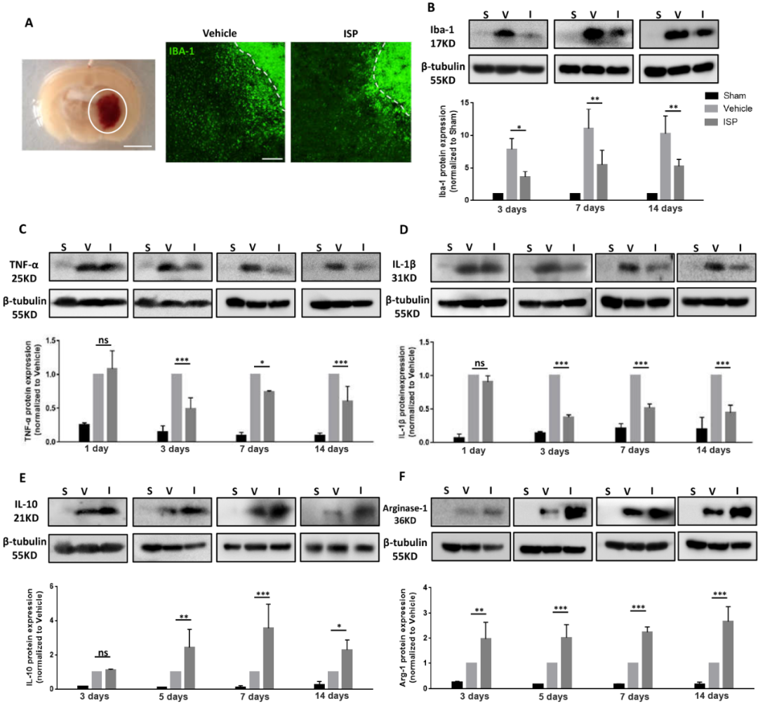 脑出血后,血肿周围免疫炎症反应迅速,小胶质细胞激活并且分泌多种炎症因子,参与神经损伤与修复[3]。利用免疫荧光染色和免疫印记测试,作者发现,与vehicle组相比,ICH损伤后ISP的系统性用药能够显著减少小胶质细胞激活(图2 a, b)。并且,与Vehicle组相比,ISP的应用在ICH后的3、7、14天明显降低促炎因子TNF-α和IL-1β的表达,在5、7、14天明显增加抗炎因子IL-10和Arginase-1的表达(图2 c-f)。这些结果表明,ISP可以改善ICH后血肿周围区域的炎症反应。