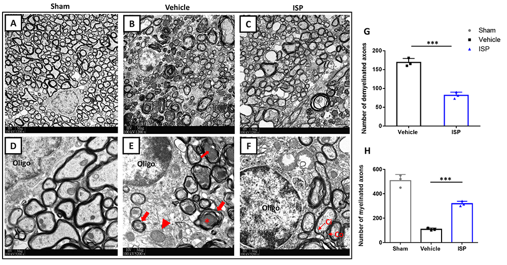 除免疫炎症改变之外,作者就ISP对血肿的作用,纹状体和颈段CST的白质完整性也进行了探讨。结果表明,与vehicle组相比,血肿在ISP治疗后的第3天和第7天明显减少(图3 a, b)。SMI32/MBP比值常用于评估轴突脱髓鞘化[4]。利用免疫荧光染色,作者分别在ICH损伤后的4周和8周,量化脑血肿周围和颈C5段脊髓背侧CST的SMI32/MBP比值。结果显示,相比于vehicle组,ISP组SMI32/MBP比值明显降低(图3 c-h)。并且,在8周时间点利用透射电镜对比了假手术组、vehicle组和ISP组的颈C5段背侧CST轴突髓鞘细节,结果显示ISP组髓鞘形态及厚度明显优于vehicle组(图4)。以上结果表明ISP治疗可持续减少脑出血引起的纹状体及脊髓背侧CST的退行性变化。