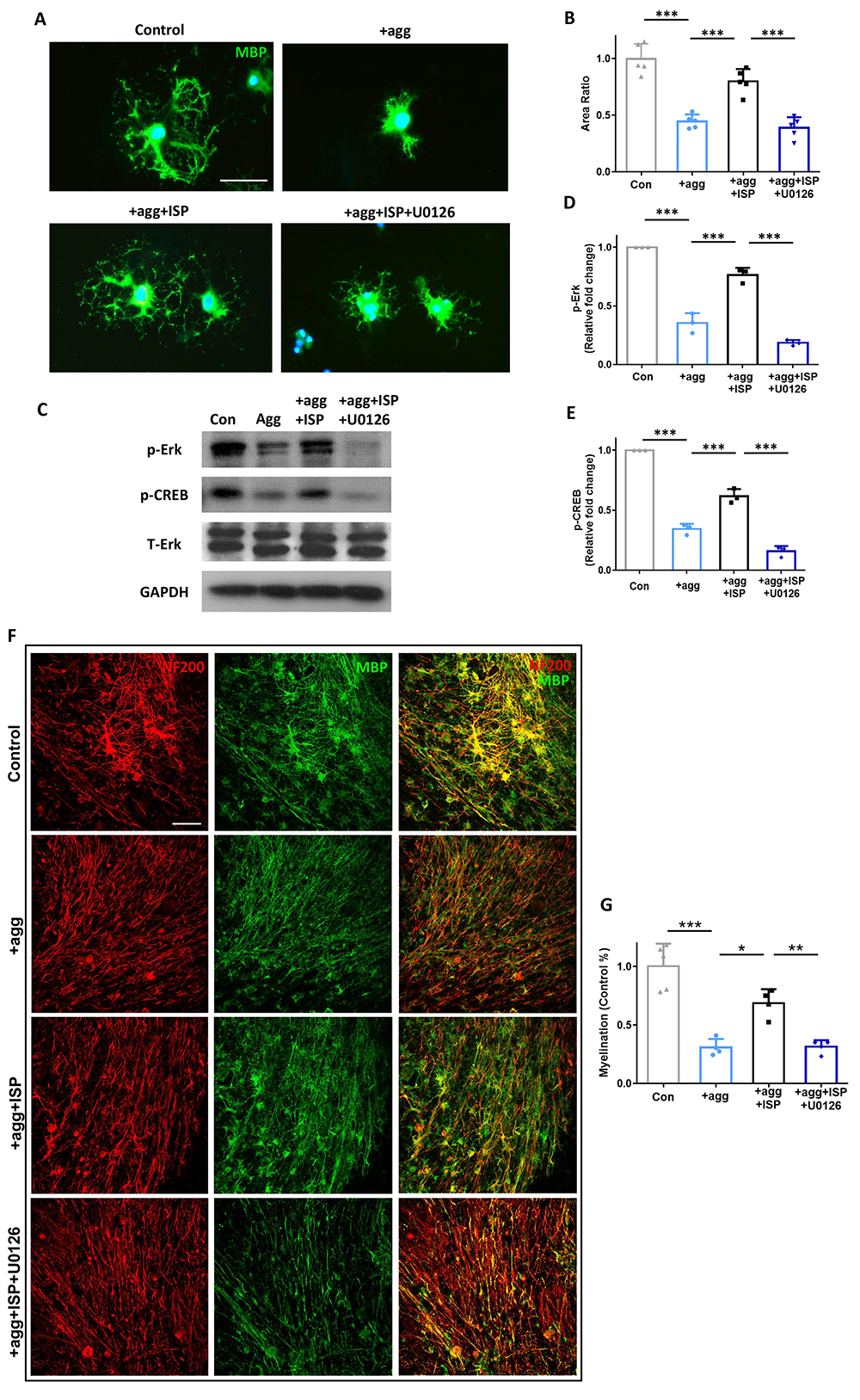 图4结果表明在体内ISP能够促进轴突髓鞘化。接下来,作者利用体外细胞培养模型,进一步探究ISP对少突胶质细胞(oligodendrocytes,OLs)成髓鞘的作用[5]。结果显示,ISP通过调控Erk/CREB信号通路,不仅可以显著增加OLs突起生长面积,还能促进轴突髓鞘化(图7)。