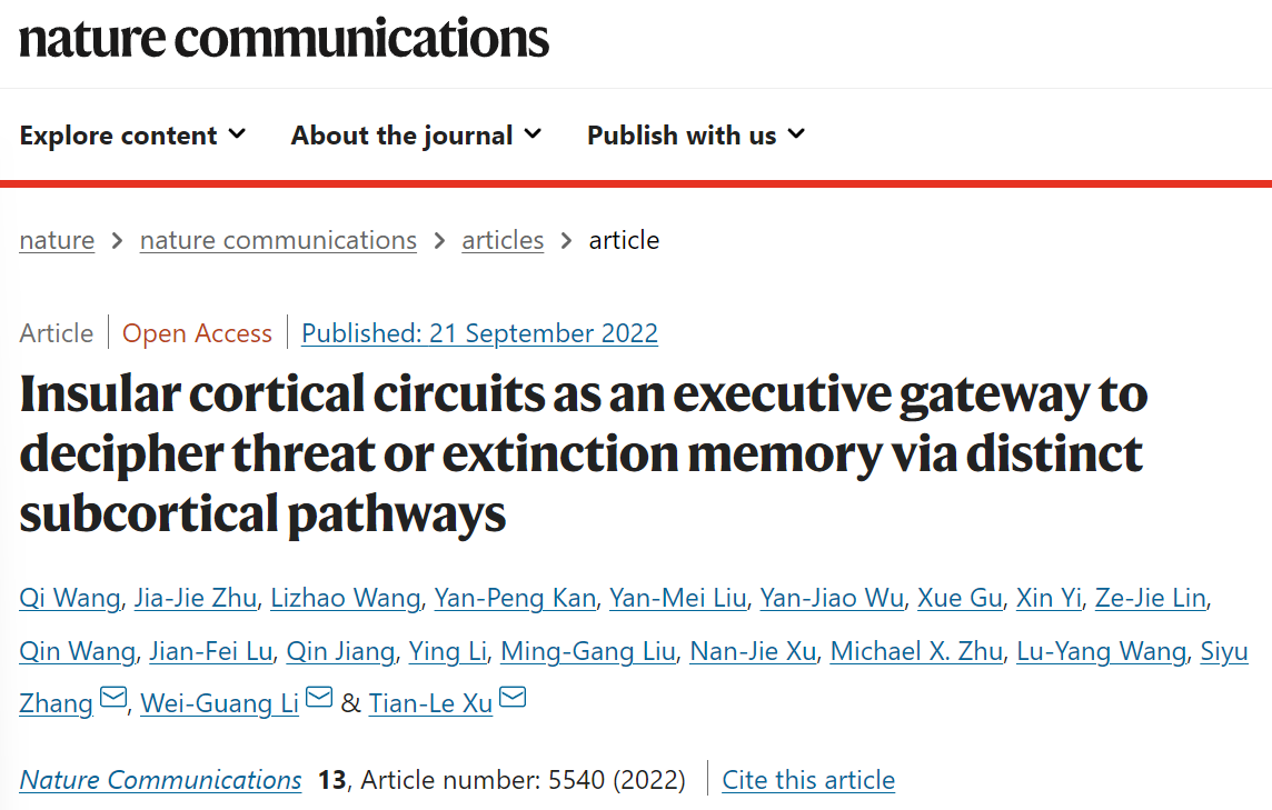 2022年9月21日,上海交通大学基础医学院徐天乐教授团队,复旦大学脑科学转化研究院李伟广研究员和上海交通大学基础医学院张思宇研究员等合作在Nature Communications在线发表题为Insular cortical circuits as an executive gateway to decipher threat or extinction memory via distinct subcortical pathways(投射依赖的岛叶皮层神经元亚群执行门控恐惧和消退记忆的机制)的研究论文。该研究综合运用动物行为学、神经活性捕捉原位标记、光遗传学、神经环路示踪、电生理、在体光纤记录等多种技术手段,揭示了以岛叶皮层为中心调控恐惧和消退记忆的皮层间、皮层内和皮层下的机制,找到了恐惧和消退记忆一键切换的脑区,为理解抑郁症、焦虑症、创伤后应激障碍等重大情感障碍疾病治疗后复发提供了全新的思路。