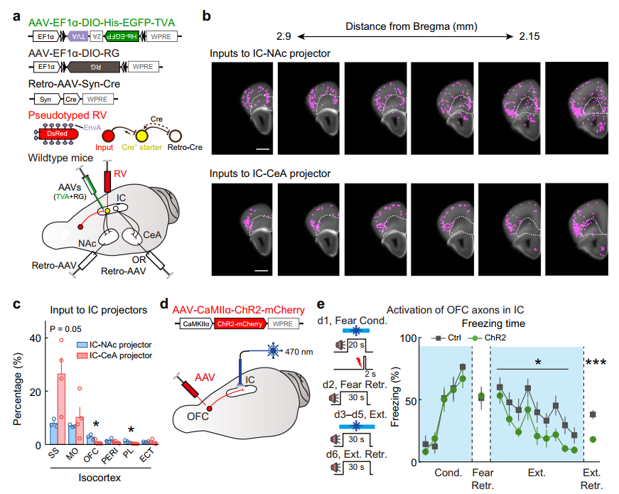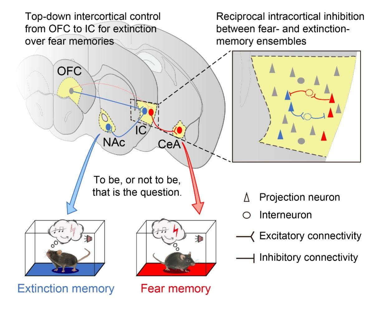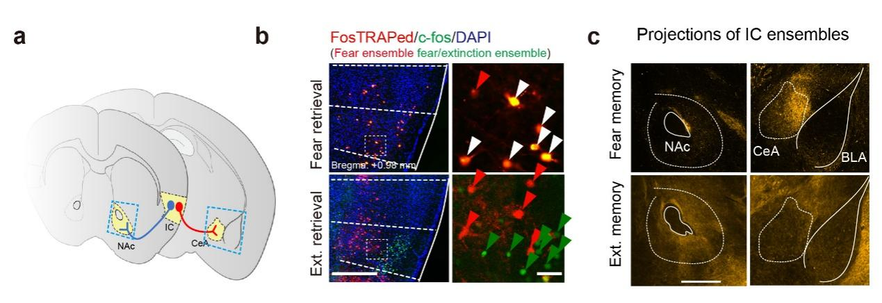 现代神经科学认为,记忆存储在被称为“印迹细胞”(engram cell)的神经元集群,成功回忆记忆涉及到这些神经元集群的重新激活。针对印迹细胞基础,研究人员利用神经活性细胞群靶向重组(targeted recombination in active populations, TRAP)技术,发现恐惧记忆和消退记忆激活不同的岛叶皮层(IC)神经元,并且被恐惧记忆与消退记忆激活的神经元投向不同的下游脑区,恐惧记忆神经元集群优先投射至中央杏仁核(CeA)脑区,而消退记忆神经元集群则主要投射至伏隔核(NAc)脑区(图1),并且光遗传学抑制记忆习得过程中激活IC神经元可以抑制记忆的提取。