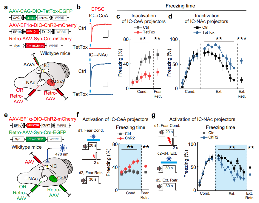 在功能学验证方面,研究人员进行了“激活和失活”实验,借助破伤风毒素轻链改造的病毒,特异的阻断IC-CeA投射神经元递质释放,可以抑制恐惧记忆的形成;特异的阻断,IC-NAc投射神经元递质释放,可以抑制恐惧消退记忆的形成;借助光遗传学技术,进行更加实时的干预发现,激活IC-CeA投射神经元,可以促进恐惧记忆的形成;光遗传学激活IC-NAc投射神经元,可以促进恐惧消退记忆的形成(图2)。
