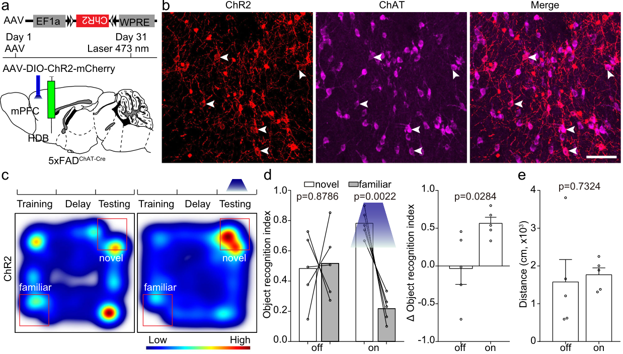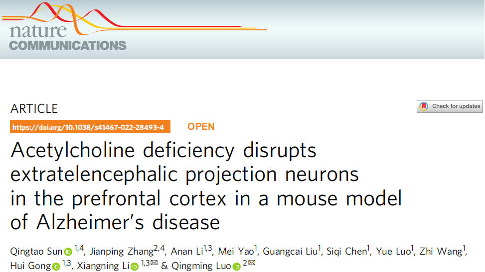 2022年2月22日,华中科技大学武汉光电国家研究中心生物医学光子学功能实验室、Britton Chance生物医学光子学研究中心李向宁教授联合中国科学院院士、海南大学校长骆清铭教授在《Nature Communications》发表题为“Acetylcholine deficiency disrupts extratelencephalic projection neurons in the prefrontal cortex in a mouse model of Alzheimer’s disease”研究论文,本文中作者利用纤维光度法和光遗传学,发现5×FAD小鼠模型内侧前额叶皮质(mPFC)中ET神经元的神经活动减少导致物体识别记忆(ORM)缺陷。5×FAD小鼠mPFC中ET神经元的激活挽救了ORM损伤,野生型小鼠mPFC内ET神经元的抑制造成ORM表达受损。mPFC中投射到乳头上核的ET神经元是ORM表达所必需的。病毒示踪和体内记录显示,在5×FAD小鼠中,mPFC ET神经元从基底前脑接受的胆碱能输入较少。此外,激活mPFC中的胆碱能纤维挽救了5×FAD小鼠的ORM缺陷,而乙酰胆碱缺乏降低了mPFC中ET神经元对熟悉物体的反应。综上所述,本文研究结果揭示了5×FAD小鼠ORM损伤背后的神经机制。