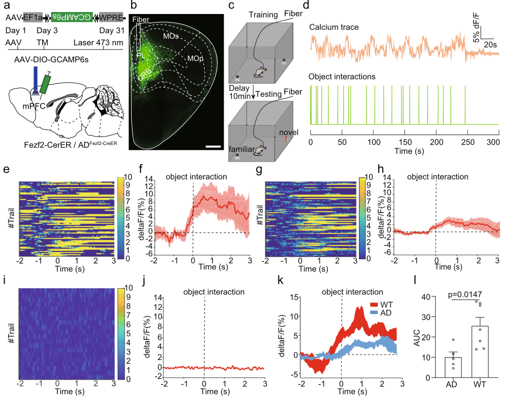 研究人员首先将AD模型转基因小鼠(5×FAD小鼠)与Fezf2-CreER小鼠杂交构建出特异性靶向ETmPFC神经元的AD模型小鼠,光纤钙成像技术记录结合fMOST(荧光显微光学切片断层成像)技术监测mPFC脑区ET神经元在新物体识别(NOR)任务中的活性变化,结果发现与正常小鼠相比,AD模型小鼠ETmPFC神经元对NOR的反应性明显降低,并伴随AD模型小鼠物体识别记忆(ORM)的损害。使用光遗传学技术激活AD模型小鼠mPFC脑区的ET神经元可改善ORM障碍,表明mPFC脑区的ET神经元参与AD的短期记忆障碍进程。