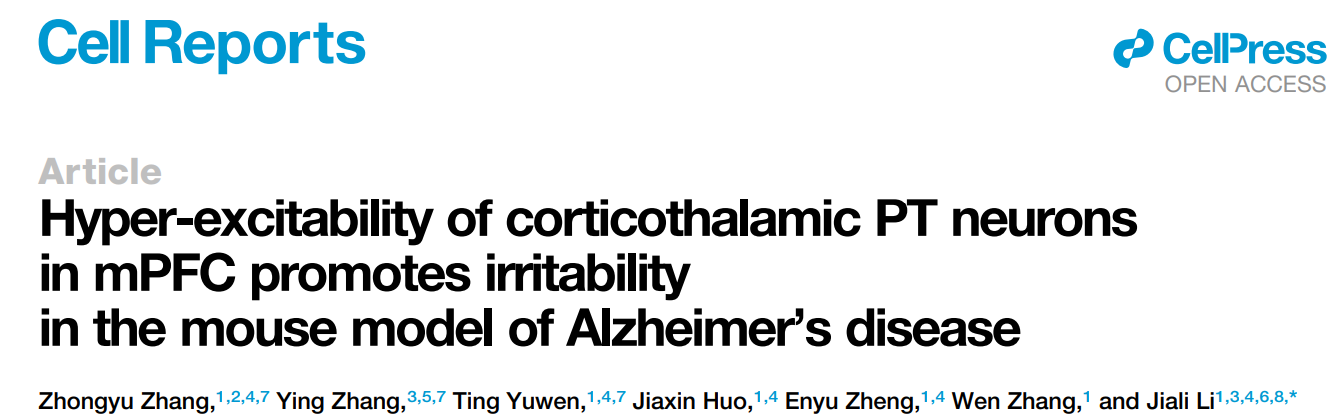 2022年11月1日,国际杂志Cell Reports在线发表了北京大学麦戈文脑研究中心/北京大学中国药物依赖性研究所研究员李家立课题组研究论文“Hyper-excitability of corticothalamic PT neurons in mPFC promotes irritability in the mouse model of Alzheimer’s disease”。该研究揭示了锥体束(pyramidal tract,PT)神经元在阿尔茨海默病(Alzheimer’s disease,AD)中发生的异质性电生理异常,并分别探究了两类PT神经元在AD易激惹症状中发挥的作用。通过电生理学的全细胞记录和化学遗传干预手段,作者们发现内侧前额叶皮层(medial prefrontal cortex,mPFC)A-typePT神经元兴奋性的异常增加介导了AD小鼠的易激惹症状。