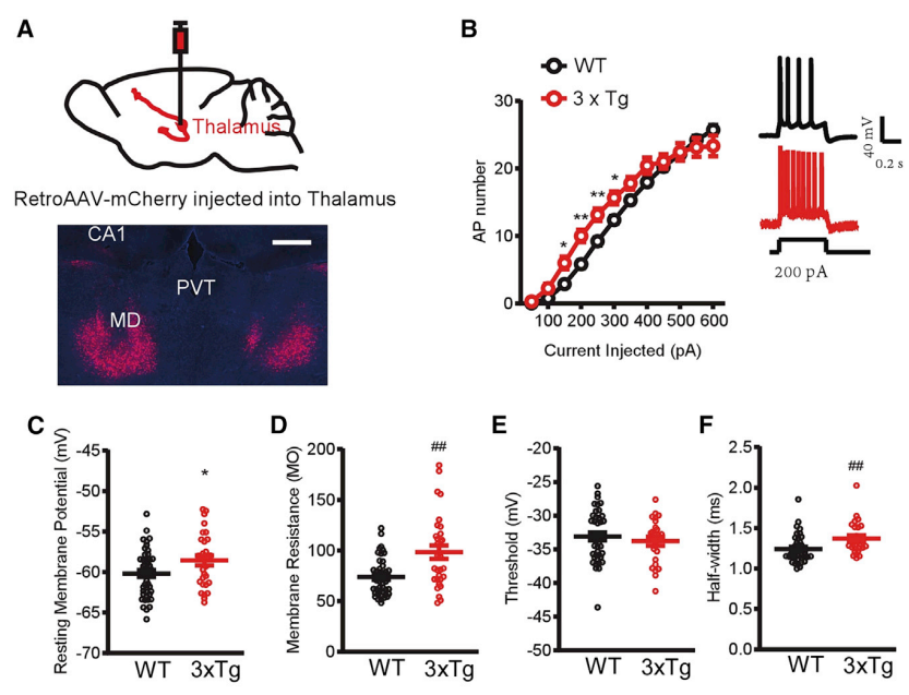 为了研究两类神经元在AD中的电生理异常,作者们利用其投射区域不同,使用逆向示踪病毒对二者进行标记,从而分别对其进行全细胞记录,发现AD小鼠模型两类神经元的内在兴奋性异常呈现高度差异性。在模型小鼠中,以投射至丘脑为首的A-typePT神经元表现出了内在兴奋性的增强和动作电位发放的增加;而以投射至脑干为主的B-typePT神经元却表现出了动作电位容纳能力的降低和动作电位发放的减少。