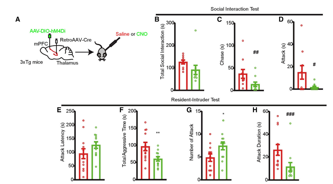 为了进一步验证A-typePT神经元的兴奋性增加与小鼠攻击行为之间的关系,作者们通过逆向示踪病毒定位、Cre重组酶诱导,在此类神经元中表达了化学遗传受体,发现抑制此类神经元可以有效的缓解AD小鼠过高的攻击行为。