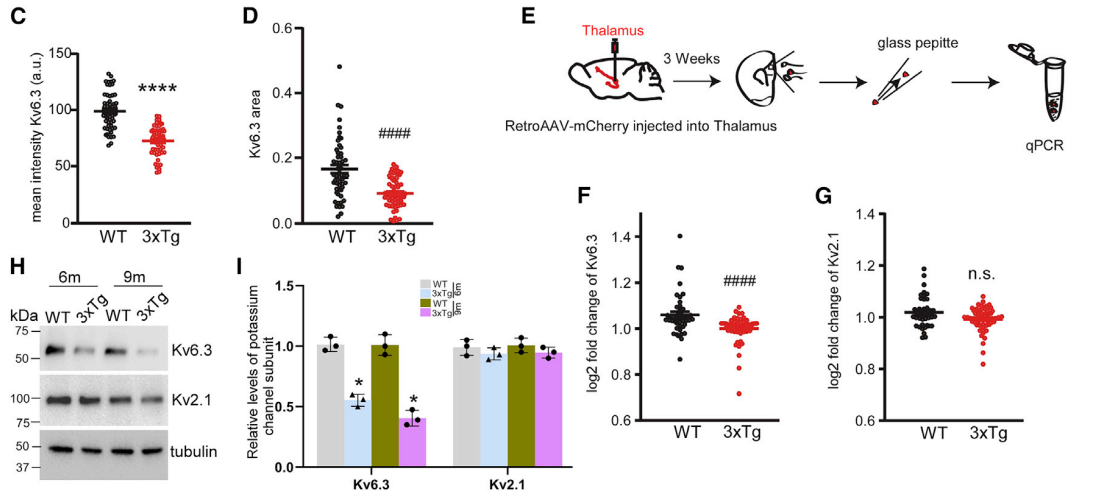 在确定了A-typePT神经元在AD攻击行为中的重要作用后,作者们继续探究了此类神经元兴奋性增加的原因。两类PT神经元的电生理异常不同,作者们怀疑是由于二者表达的不同,导致了病变的靶离子通道不同。通过查阅转录组学数据,作者们发现电压门控钾离子通道Kv6.3只在A-typePT神经元中表达,且在内在兴奋性中发挥着重要作用。通过单细胞qPCR、蛋白免疫印迹等分子生物学手段,作者们发现Kv6.3在A-typePT神经元中表达降低。