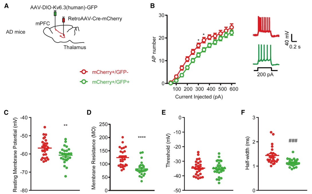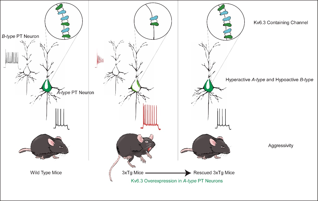 本文作者运用全细胞记录、单细胞qPCR、化学遗传干预等手段,发现mPFC中PT神经元在AD中的重要作用,揭示了两类PT神经元在AD中的差异性病理学变化,A-typePT神经元中Kv6.3的表达下调是其功能异常和AD小鼠攻击行为增加的原因。