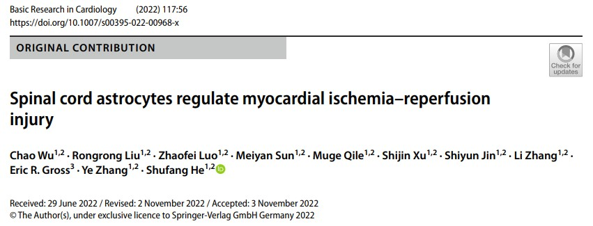 2022年11月11日,安徽医科大学第二附属医院麻醉与围术期医学科张野教授/何淑芳副教授科研团队在Basic Research in Cardiology(《心脏病学基础研究》)上发表了题为“Spinal cord astrocytes regulate myocardial ischemia–reperfusion injury”(脊髓星形胶质细胞调控心肌缺血-再灌注损伤)的研究论文,揭示了脊髓星形胶质细胞参与心肌缺血损伤的神经调控机制。该研究发现心肌I/R损伤引起脊髓星形胶质细胞活化,利用化学遗传学方法(DREADDs),将星形胶质细胞特异的兴奋性(hM3Dq)或抑制性(hM4Di)AAV病毒,定位注射到胸段脊髓,在配体CNO作用下可特异性激活或抑制星形胶质细胞。结果显示,hM3Dq介导的脊髓星形胶质细胞活化,可加重心肌I/R损伤,其机制可能是通过促进脊髓辣椒素受体(TRPV1)活化和神经肽[SP(P物质)/CGRP(降钙素基因相关肽)]释放,并进一步增强心脏交感神经活性;相反,hM4Di介导的脊髓星形胶质细胞活性抑制,通过抑制TRPV1和SP/CGRP,对心脏发挥保护作用。