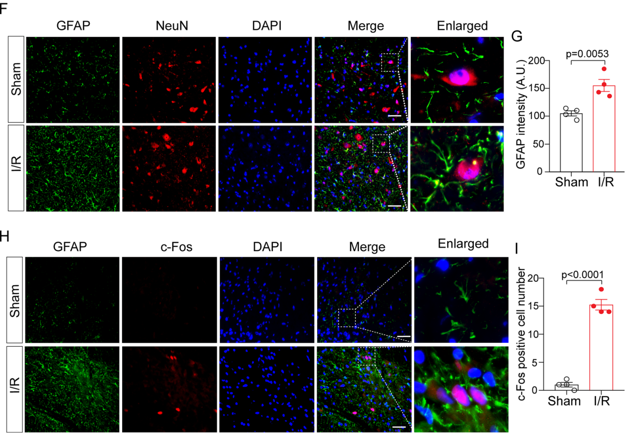 研究人员首先通过建立大鼠心肌缺血再灌注损伤模型,采用免疫荧光和Western blot技术检测支配心脏的胸段脊髓(T2-T6)中GFAP的表达。结果发现心肌I/R损伤后脊髓中GFAP的表达量显著增加,此外,还发现脊髓背角区c-Fos的表达也显著增加。