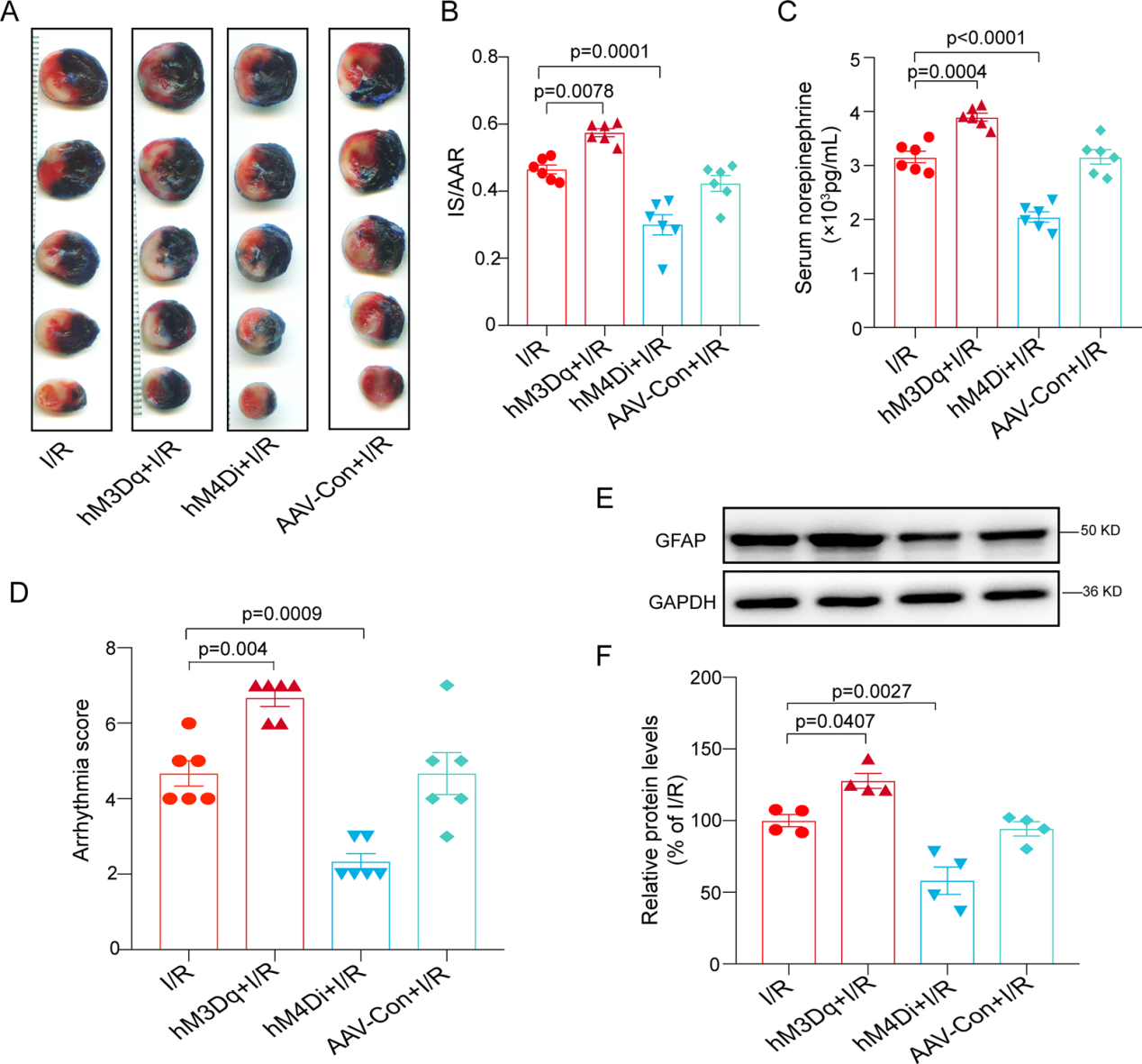 在配体CNO作用后的大鼠随后进行心肌I/R模型,结果显示:hM3Dq+I/R组梗死体积较I/R进一步扩大,而hM4Di+I/R组的梗死体积小于I/R组。随后,进一步检测血清NE(去甲肾上腺素)水平以及观察心律失常情况,同样显示兴奋脊髓星形胶质细胞导致血清NE水平进一步升高及心律失常评分增加,而抑制脊髓星形胶质细胞则导致血清NE水平降低和心律失常评分降低。这些结果表明hM3Dq介导的脊髓星形胶质细胞激活加重了心肌I/R损伤,而hM4Di介导的脊髓星形胶质细胞抑制可以保护心脏减小损伤。