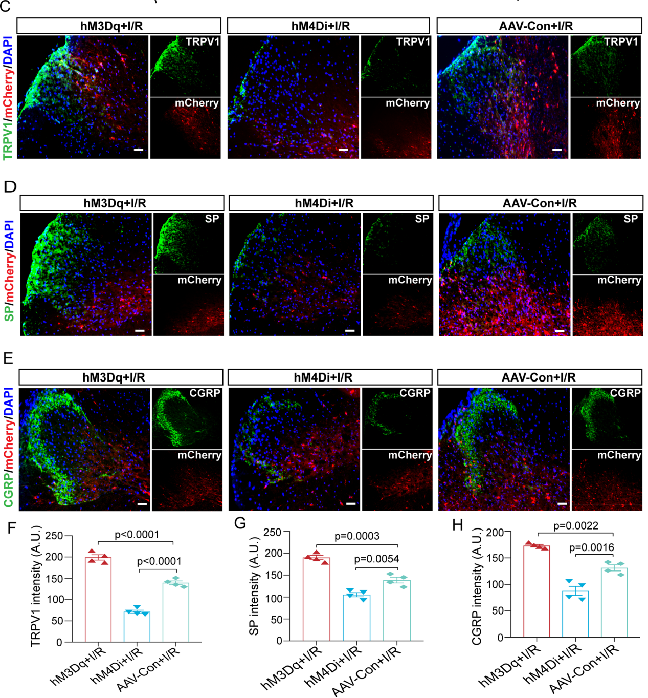 先前的研究显示TRPV1阳性心脏感觉神经元在心肌I/R期间被敏化,导致了缺血后心脏损伤。作者进一步采用免疫荧光方法检测了脊髓背角区TRPV1(辣椒素受体)、SP(P物质)和CGRP(降钙素基因相关肽)的表达。结果显示:hM3Dq+I/R组中TRPV1、SP和CGRP的免疫染色增强,而hM4Di+I/R组中染色大大减弱。这些数据表明,hM3Dq或hM4Di对脊髓星形胶质细胞活性的操纵分别增强或抑制了脊髓TRPV1激活和SP/CGRP释放。