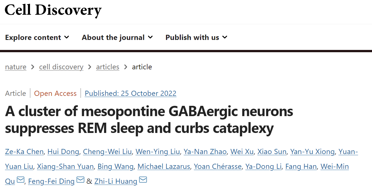 2022年10月25日,复旦大学脑科学研究院黄志力教授团队在Cell Discovery杂志在线发表论文“A cluster of mesopontine GABAergic neurons suppresses REM sleep and curbs cataplexy”,报道了REM睡眠终止的神经环路机制:位于脑干深部中脑核团背侧部(dorsal part of the deep mesencephalic nucleus, dDpMe)的GABA能神经元及其神经环路具有控制REM睡眠的终止以及发挥缓解猝倒症的功能,这一发现为REM睡眠调控机制研究带来了重要突破。