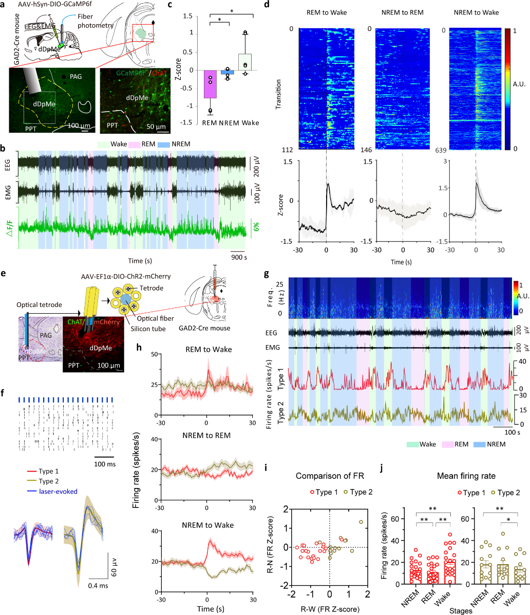 为了进一步确定dDpMeGABA神经元是否具有神经活动的异质性,作者采用光电极在体多通道技术同步记录了小鼠脑电信号和dDpMeGABA单细胞活动。结果表明,dDpMe中有两种类型的GABA能神经元,即半波长短、振幅低的1型,以及半波长长、振幅高的2型。这些1型神经元大多在REM睡眠期相对不活跃;2型神经元的平均放电率在REM和NREM睡眠期间比清醒时更活跃。此外,作者还指出,1型和2型神经元的放电模式不同,1型神经元在REM睡眠中的放电速率最低,而2型神经元在清醒状态下的放电速率最小。这些发现反映了dDpMe中GABA能神经元(包括1型和2型神经元)在从REM睡眠过渡到NREM睡眠或觉醒时的生理活性变化,这表明它们参与了REM睡眠和状态转换的调节。
