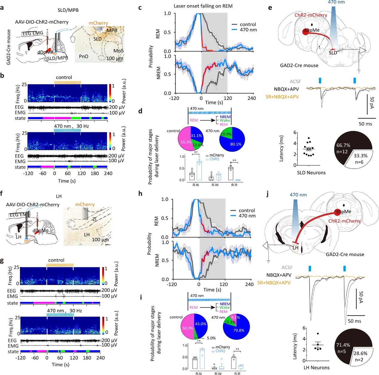 3. 激活dDpMeGABA神经元在SLD/MPB或LH的轴突末梢抑制REM睡眠并促进REM向NREM的转换