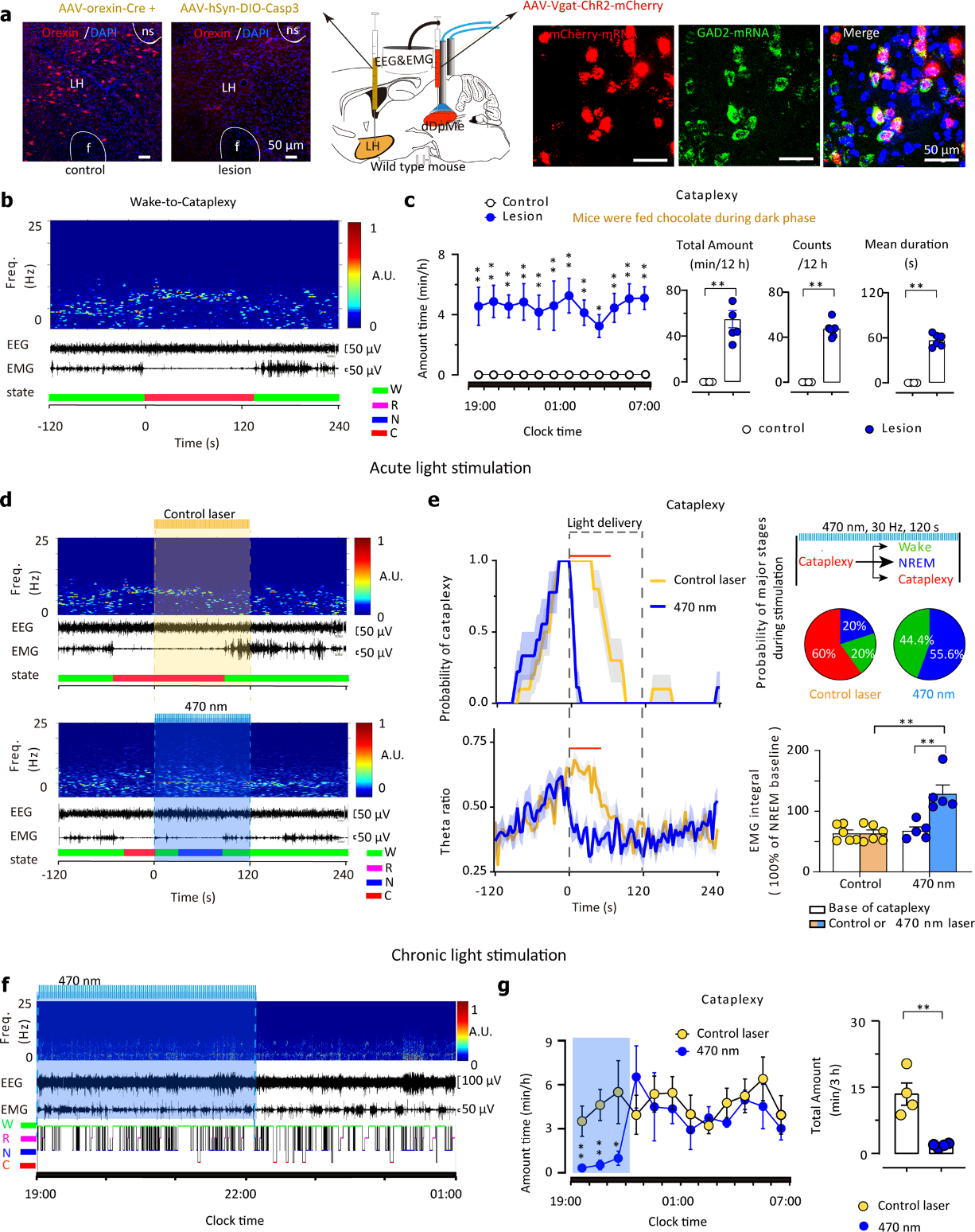为了确定dDpMeGABA能神经元在猝倒中的作用,作者在条件性食欲素神经损伤小鼠中应用了dDpMeGABA能神经元的光遗传学激活。作者将Vgat-ChR2-mCherry腺相关病毒注射到dDpMe中以靶向GABA能神经元,并将orexin-Cre/DIO-caspase-3混合的腺相关病毒注入LH区域。典型图显示,2周后,食欲素免疫反应性LH区域没有食欲素表达。此外,大多数mCherry标记的Vgat神经元是GAD2 mRNA阳性的,并且在很大程度上与GABA共定位。由于巧克力通常被用作触发小鼠猝倒的情绪奖励刺激物,作者在活动期给小鼠喂食巧克力,发现orexin-caspase-3小鼠在清醒期间突然出现肌无力和REM样睡眠的猝倒,并表现出大量猝倒。黑暗时期猝倒的发作次数和平均持续时间为显著增加。