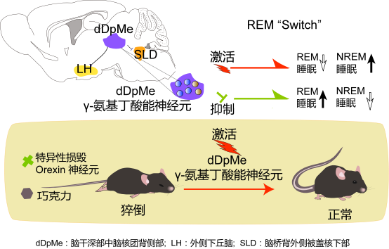 人类睡眠周期可分为非快速眼动(NREM)睡眠和快速眼动(REM)睡眠两个时相,周期性节律和连续性对睡眠生理学至关重要。其中,REM睡眠与大脑发育,记忆巩固,情绪疾病,神经退行性疾病等相关,REM睡眠的失调导致多种睡眠障碍,包括发作性睡病。然而目前关于REM睡眠发生和终止的神经生物学机制,仍未完全明了。此外,临床上的发作性睡病是一类难治性的慢性疾病,在强烈的情绪诱发时,其患者在清醒状态下突然发生猝倒,并伴随theta波升高、肌张力消失的REM样表现。
