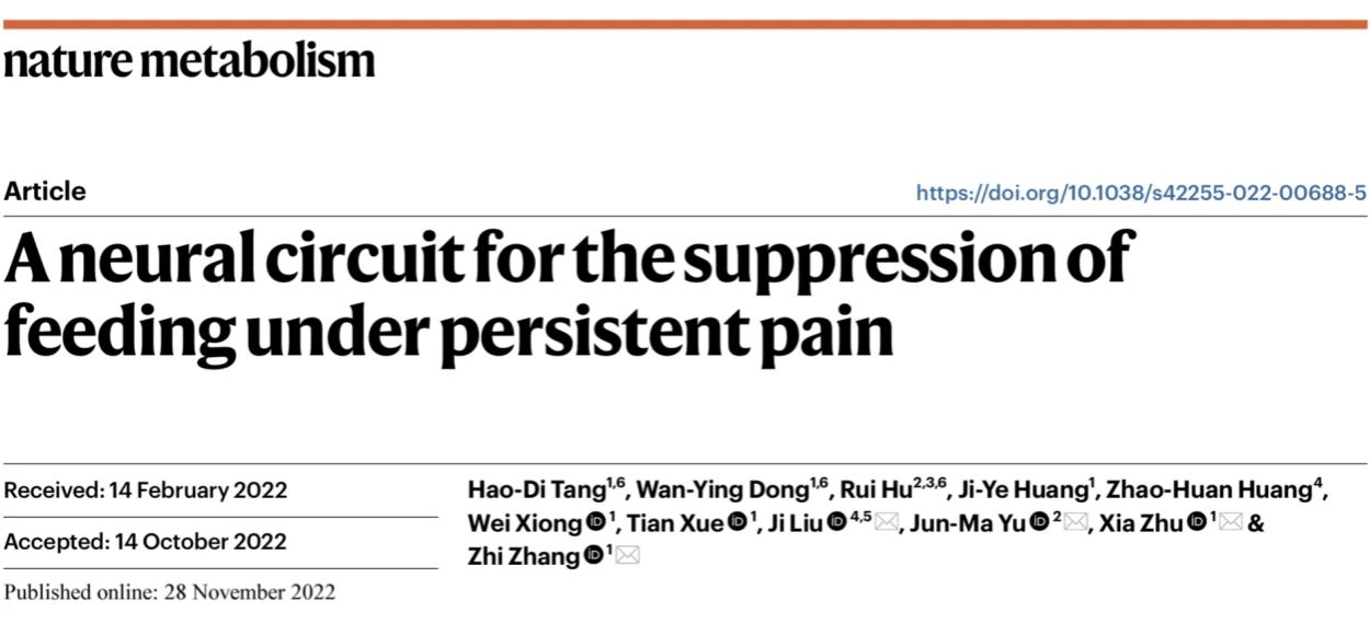 2022年11月28日,张智/朱霞(中国科学技术大学博士后)团队与刘际研究员(中国科学技术大学先进技术研究院)和余骏马主任医师团队(安徽医科大学第三附属医院麻醉科)合作在Nature Metabolism上发表了文章“A neural circuit for the suppression of feeding under persistent pain”,揭示了疼痛降低进食量和摄食动机的神经基础。