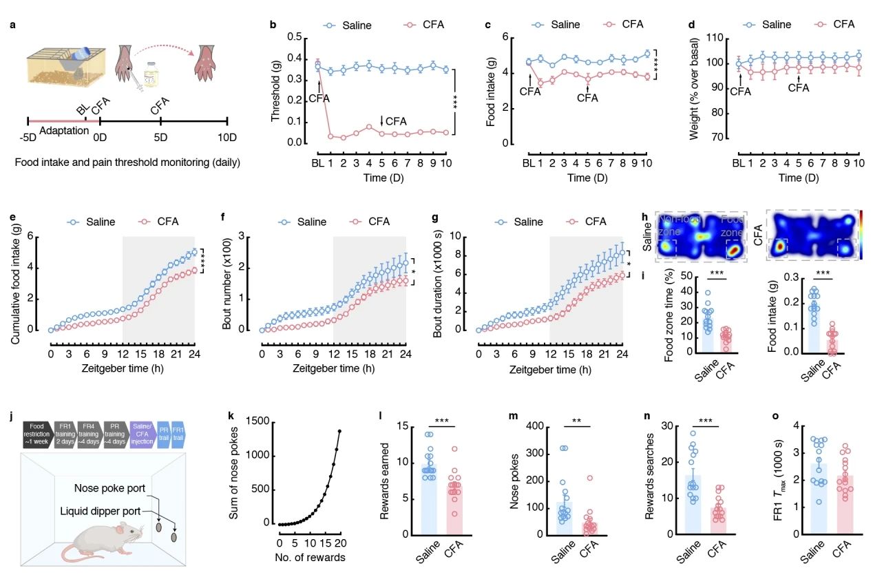 在本研究中,作者利用足底炎症(和神经结扎)引起疼痛的模型小鼠,通过连续的进食监测、进食模式分析和自由进食行为测试等实验方法发现这些小鼠的进食量显著减少,并且蔗糖操作任务测试的结果显示CFA(完全弗氏佐剂)模型小鼠伴随摄食动机的降低。