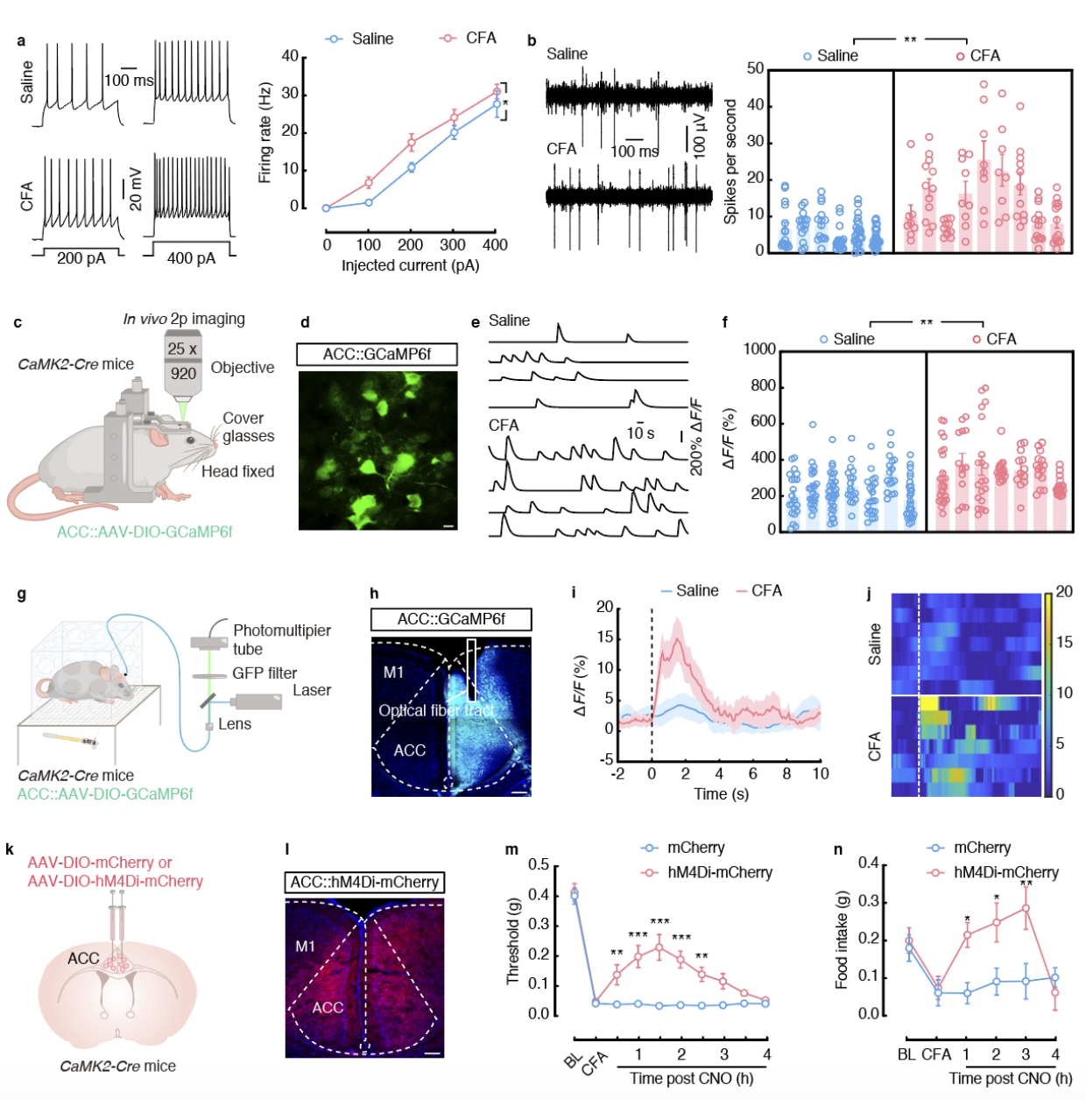 鉴于前扣带回皮层(ACC)在痛觉信息编码中发挥着重要作用,作者综合运用脑片膜片钳、在体电生理技术发现ACC中谷氨酸能神经元(Glu)在持续疼痛环境下被显著激活。由于钙信号也是指示神经元活性的指标之一,作者将Cre依赖的钙指示剂GCaMP6f注射到CaMK2-Cre小鼠的ACC中,通过双光子钙成像、光纤记录等研究手段再次验证了CFA模型小鼠ACCGlu神经元的活性显著增加。此外,通过化学遗传学方法特异的抑制ACCGlu神经元可显著缓解CFA模型小鼠的痛敏,并且显著改善疼痛导致的进食减少。