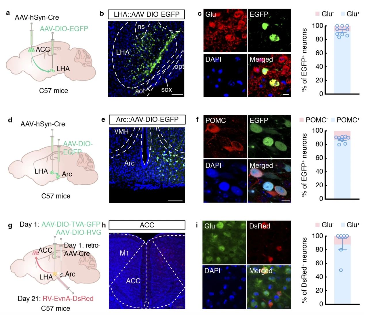 为了进一步探究疼痛导致进食减少的神经环路机制,作者以ACC为起点进行正向病毒示踪,发现GluACC神经元向外侧下丘脑(LHA)投射,并且GluACC神经元主要支配的是LHA中的谷氨酸能神经元。随后,再次通过正向病毒示踪策略发现GluLHA神经元投射到下丘脑弓状核(Arc)中阿片促黑激素皮质素原神经元(POMC)—调控摄食的关键脑区和神经细胞。接下来,作者通过逆向病毒示踪,进一步对GluACC→GluLHA→POMCArc这一三级神经环路的结构进行了验证。