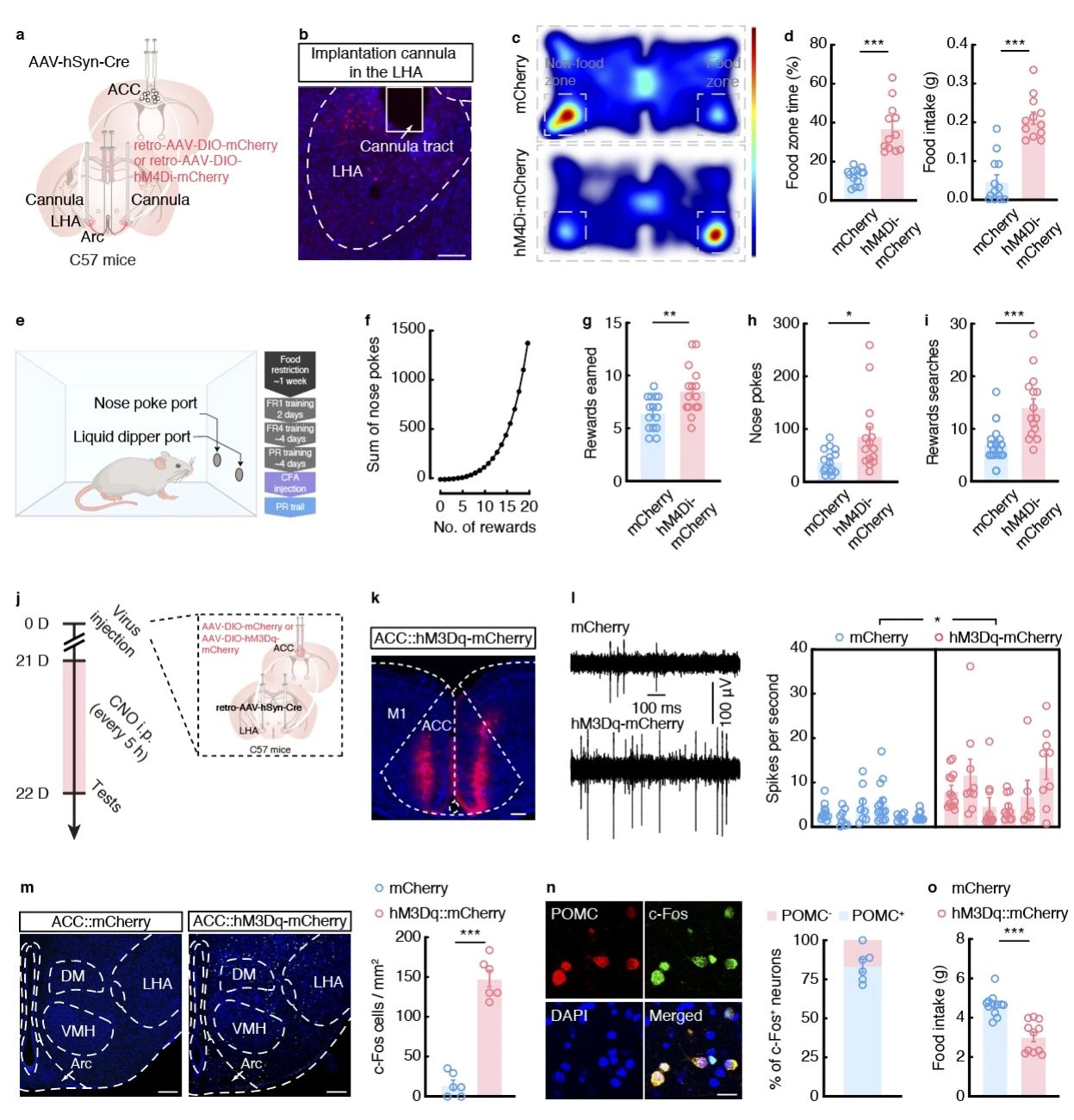 最后,为探究GluACC→GluLHA→POMCArc神经环路是否参与疼痛导致进食减少的调控,作者通过化学遗传学方法特异的抑制GluACC→GluLHA→POMCArc神经环路,发现抑制该环路后可显著增加CFA模型小鼠进入食物区域的时间和进食量,并且显著改善由疼痛导致的动机降低。除此之外,作者通过在C57小鼠的LHA中注射retro-AAV-hSyn-Cre,在ACC中注射AAV-DIO-hM3Dq-mCherry的方式特异的激活支配LHA的那部分ACC神经元,会导致LHA和Arc中的c-Fos表达增加,并且观察到这些小鼠的进食量显著降低。总的来说,本研究显示GluACC→GluLHA→POMCArc神经环路参与驱动疼痛状态下的食欲不振。