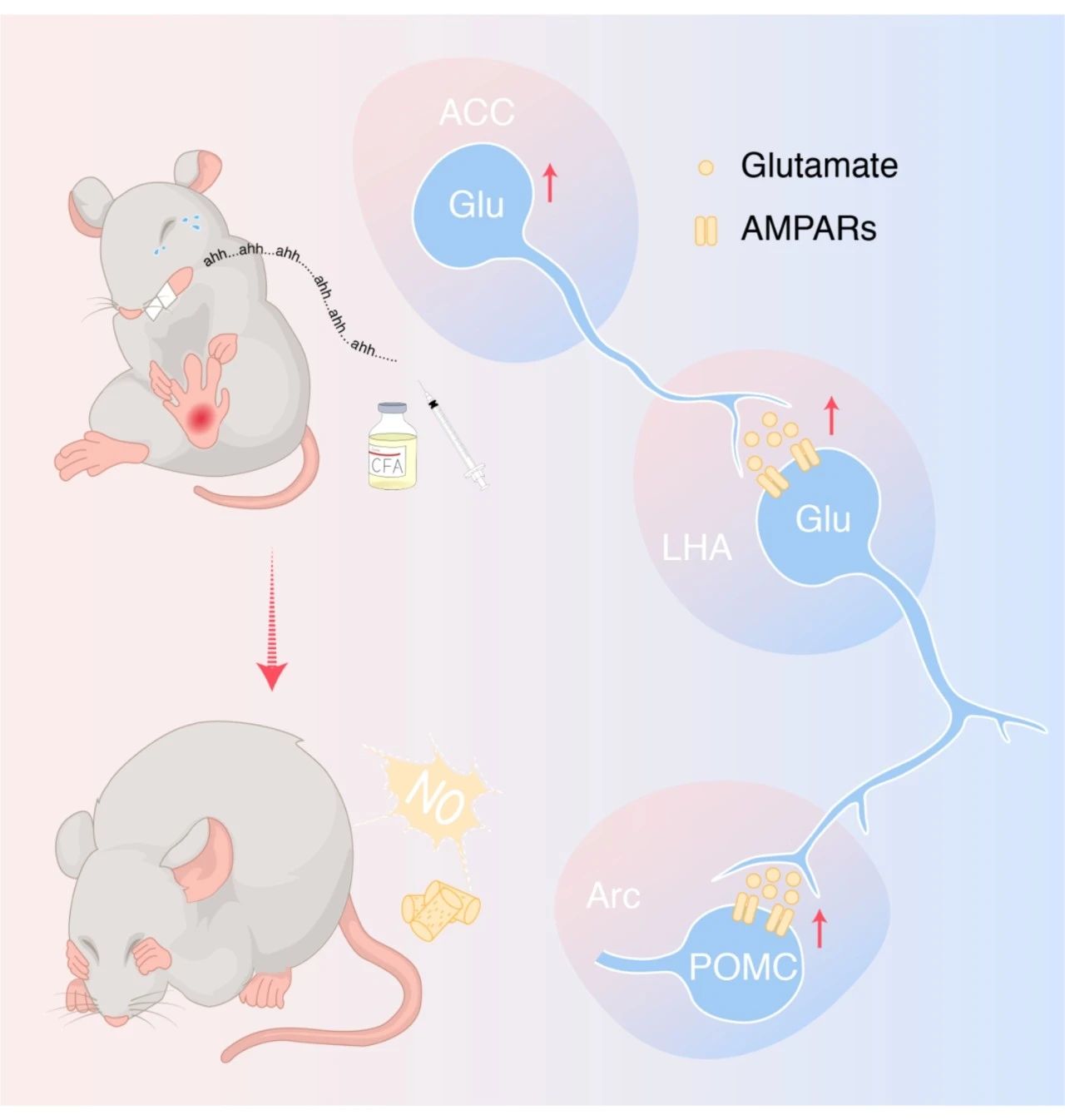 图4.GluACC→GluLHA→POMCArc神经环路参与疼痛导致进食减少的调控