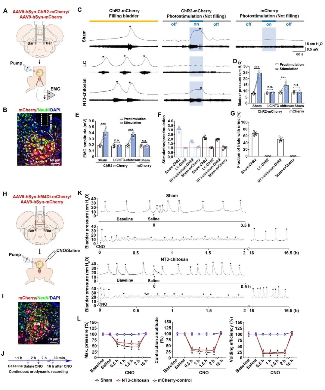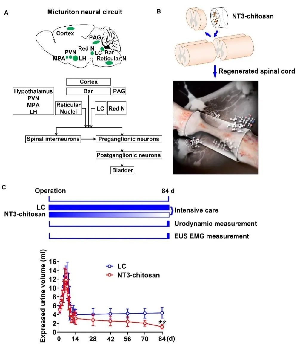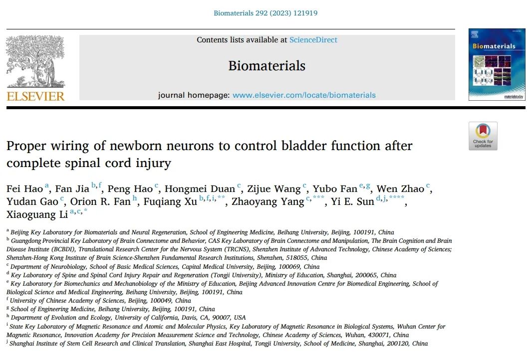 2022年11月29日,北航生物与医学工程学院、北京生物医学高精尖中心李晓光教授团队,联合首都医科大学杨朝阳教授、同济大学孙毅教授和深圳先进技术研究院徐富强教授,在国际知名杂志《Biomaterials》发表题为《Proper wiring of newborn neurons to control bladder function after complete spinal cord injury》的研究论文。本研究首次应用多种病毒神经示踪技术、光遗传学、化学遗传学和多重免疫荧光染色技术证明,NT3-壳聚糖生物活性材料可通过诱导内源性新生神经元产生,重建脊髓上排尿反射神经环路,使下尿路重获脊髓上控制;其诱导的新生神经元可整合到排尿反射神经环路中,重连控制下尿路的脊髓低级中枢和脊髓上脑高级中枢;同时证明了新生神经元在膀胱功能恢复中的重要作用。该研究首次揭示了中枢神经系统损伤后的功能恢复无需长距离的轴突再生,局部新生神经元和新生神经环路可促进损伤后的功能恢复,首次证明了新生神经元在功能恢复中的重要作用。为中枢神经系统损伤修复提供一种全新的策略,并进一步推动了医用生物活性材料在临床的应用。