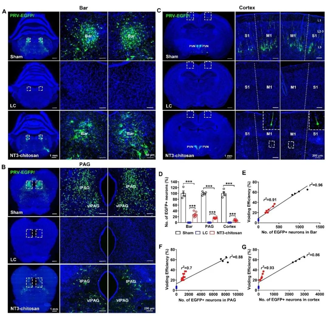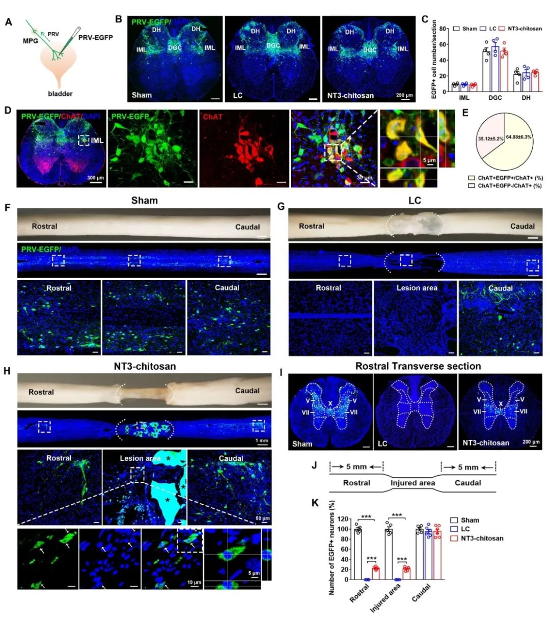 图5. NT3-壳聚糖诱导的新生神经元整合进排尿反射神经环路