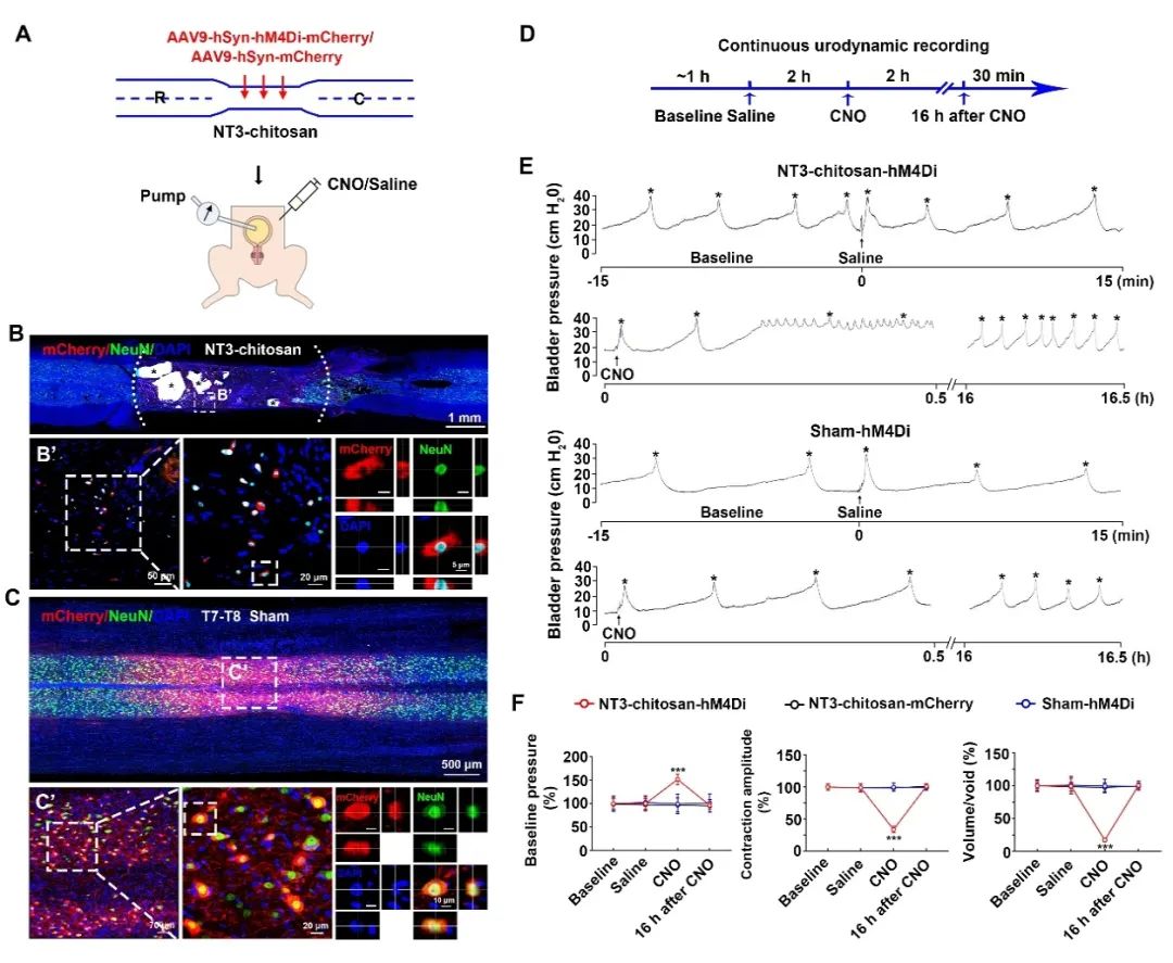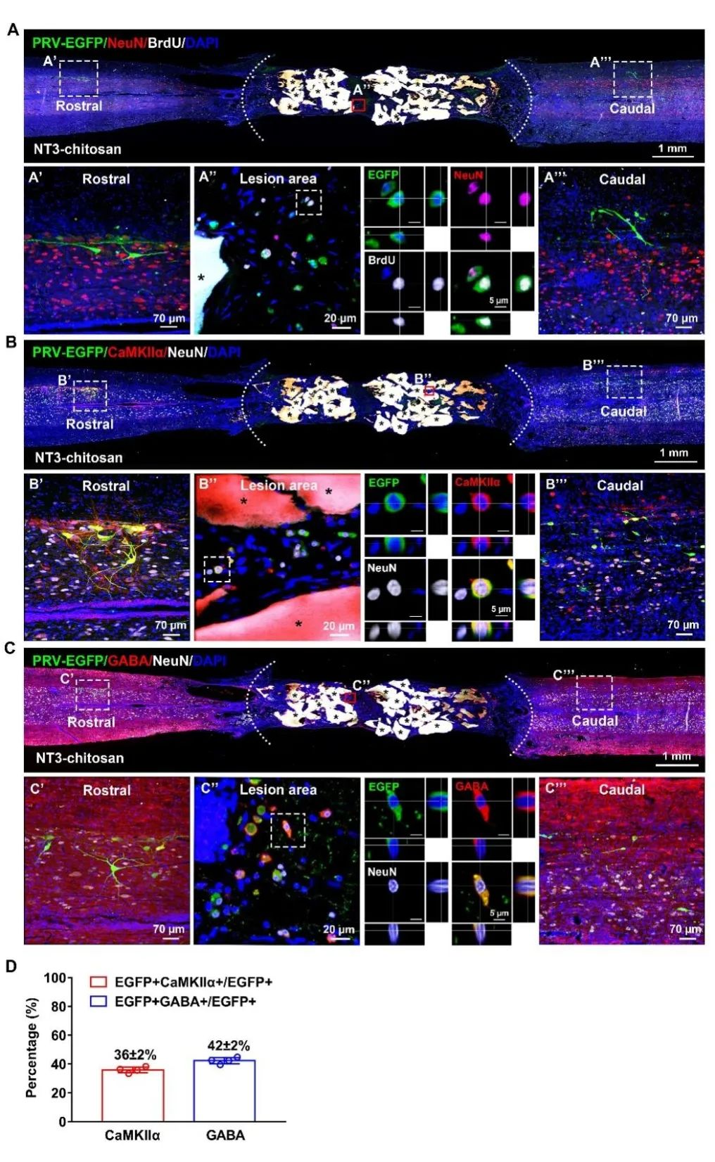 为检测NT3-壳聚糖是否可诱导新生神经元产生并整合到排尿反射神经环路中,我们取膀胱注射PRV-EGFP病毒的胸段脊髓组织,进行BrdU/NeuN/EGFP免疫荧光染色。结果显示,损伤区内可检测到BrdU/NeuN/EGFP三阳性细胞,提示NT3-壳聚糖可诱导新生神经元产生并整合到了控制排尿的神经环路。损伤区内PRV-EGFP阳性细胞中约36%为CaMKIIα阳性的兴奋性神经元,约42%为GABA阳性的抑制性神经元,提示NT3-壳聚糖诱导的新生神经元既有兴奋性神经元,也有抑制性神经元,且两者均参与到了排尿反射神经环路的重建。RV逆行跨单突触病毒示踪结果显示,Bar核神经元可与损伤区新生神经元形成直接突触连接。化学遗传学结果显示,损伤区新生神经元参与NT3-壳聚糖诱导的下尿路功能恢复。