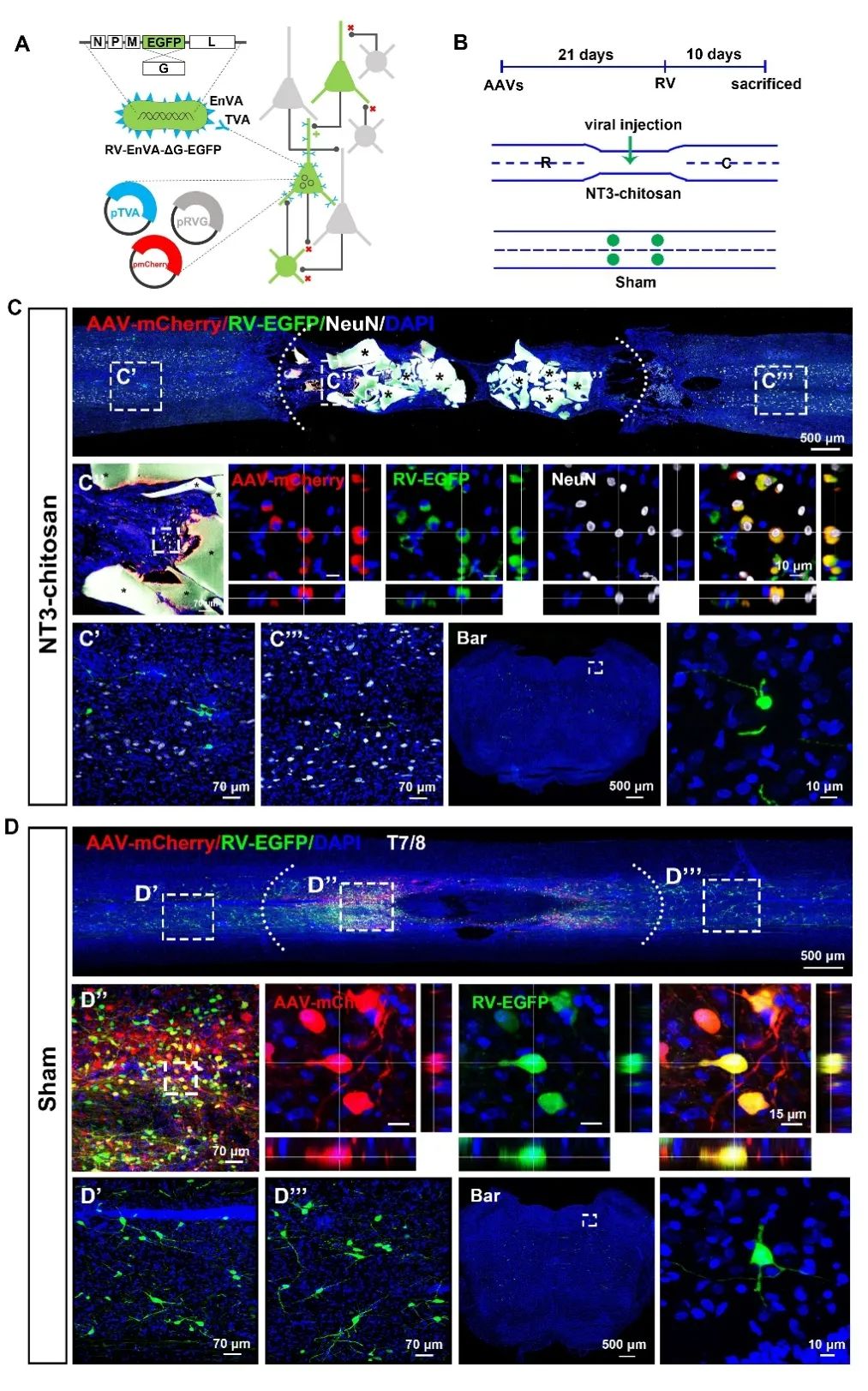 脊髓损伤修复领域长期致力于如何促进受损的轴突实现长距离轴突再生。该研究团队提出了一种新的修复理论:通过诱导内源性神经发生建立新的中继神经环路,桥接受损的头尾两端以恢复受损的神经功能。然而,这些新生的中继神经环路是否可正确整合到受损的长投射神经环路中及其整合机制目前是未知的。