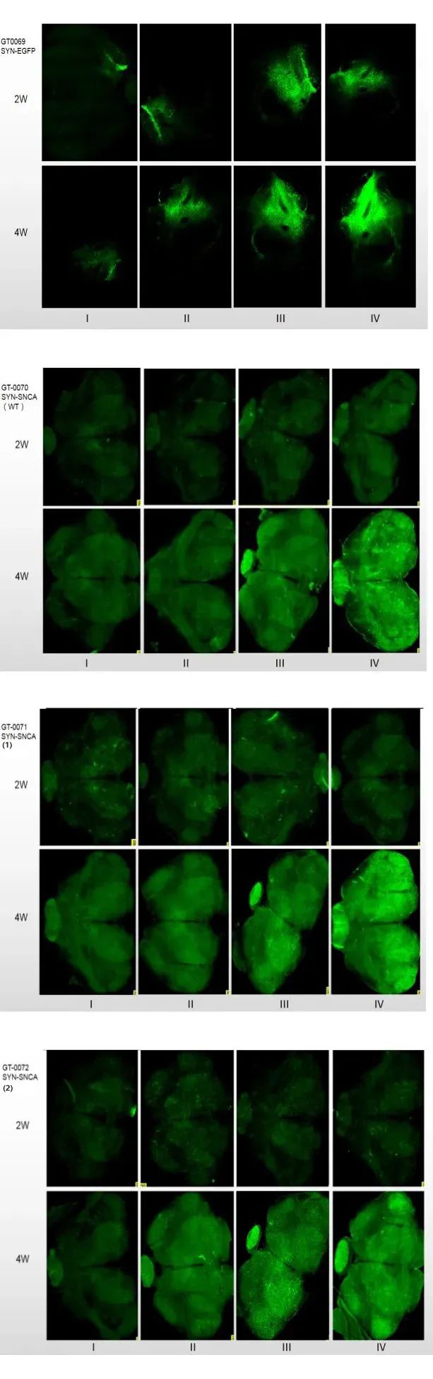 Fig.1A.注射GT-0069 SYN-EGFP病毒2w、4w后的免疫组化成像;B.注射GT-0070 SYN-SNCA(WT)病毒2w、4w后的免疫组化成像;C.注射GT-0071 SYN-SNCA(1)病毒2w、4w后的免疫组化成像;D.注射GT-0072 SYN-SNCA(2)病毒2w、4w后的免疫组化成像。
