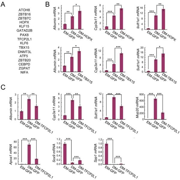 在导管类器官中利用AAV-DJ载体转导16种肝细胞富含转录因子,随后进行肝细胞分化诱导。通过qRT-PCR检测肝细胞marker(Alb、Cyp3a11、Sult1a1、Mup20和 Apoa1)及胆管细胞marker(Sox9和Spp1)表达水平。从而筛选确定了HOPX(同源域特有蛋白同源框)、TBX15(T-box 15)和TFCP2L1(转录因子CP2样1)是肝细胞分化的主要调节因子。