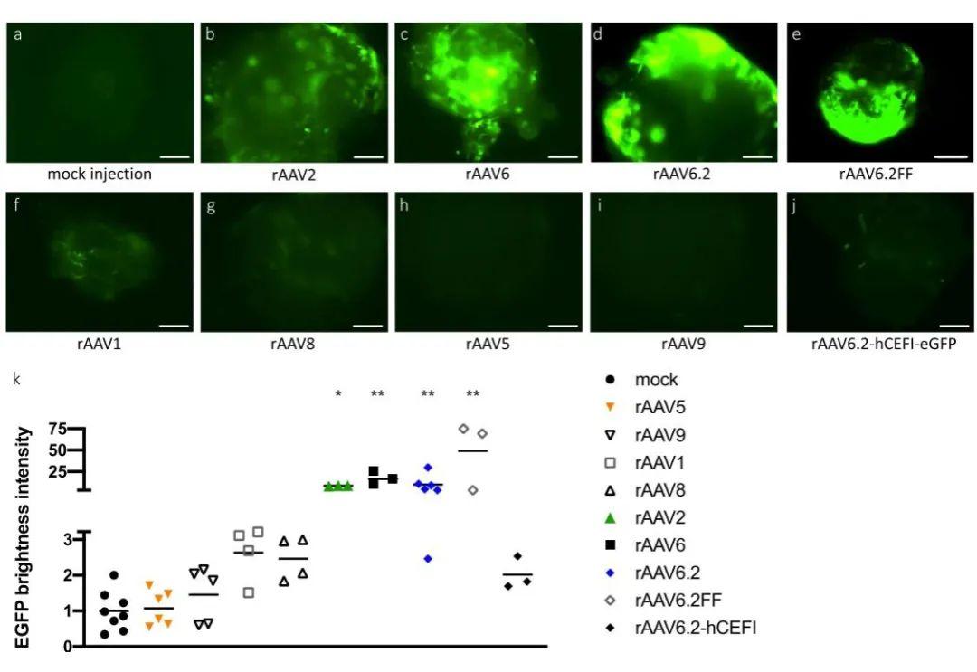 病毒载体:AAV(rAAV-CMV/hCEFI-eGFP,3.5E+8~1.0E+9 GC)