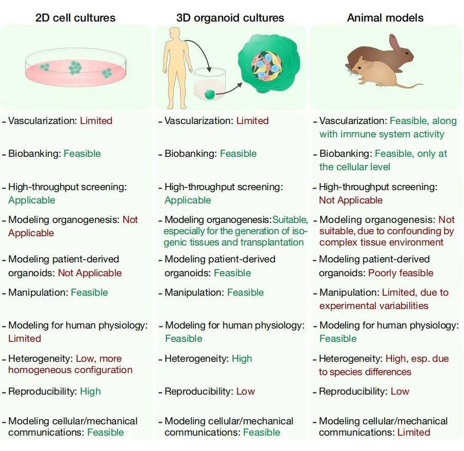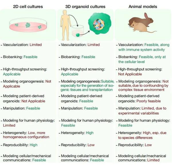 长期以来,科学家们都利用动物模型来进行疾病研究和药物开发。与二维培养和动物模型相比,类器官具有巨大的优势。类器官与2D细胞培养相比,具有更接近生理细胞组成和行为,更稳定的基因组,更适合于生物转染和高通量筛选等优势。与动物模型相比,类器官模型体外建模,操作简单,可用于研究疾病发生和发展等机理。这使其成为不同实验、建模疾病和高通量筛选的实用平台。Nature Methods如此评价类器官技术:利用干细胞直接诱导生成三维组织模型,为人类生物学研究提供了强大的方法。