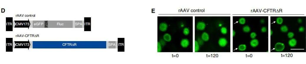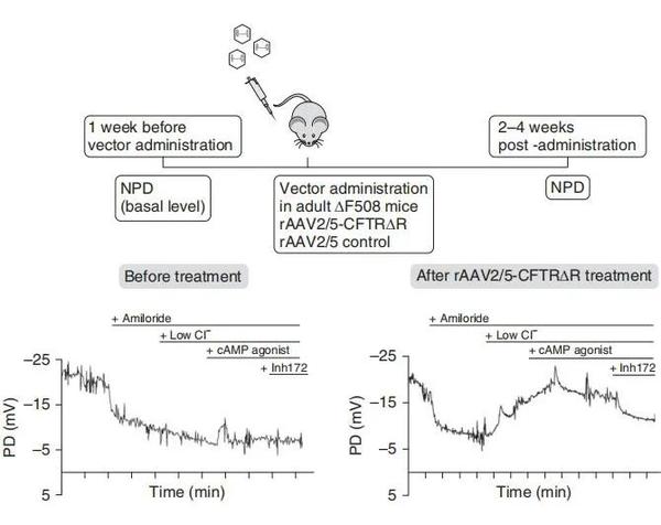 人类CFTR(囊性纤维化跨膜电导调节因子)缺陷类器官的rAAV-CFTRΔR转导导致毛喉素诱导的肿胀,使CFTR功能恢复。在小鼠体内通过rAAV2/5介导的CFTRΔR转导恢复了鼻粘膜中的离子转运缺陷。