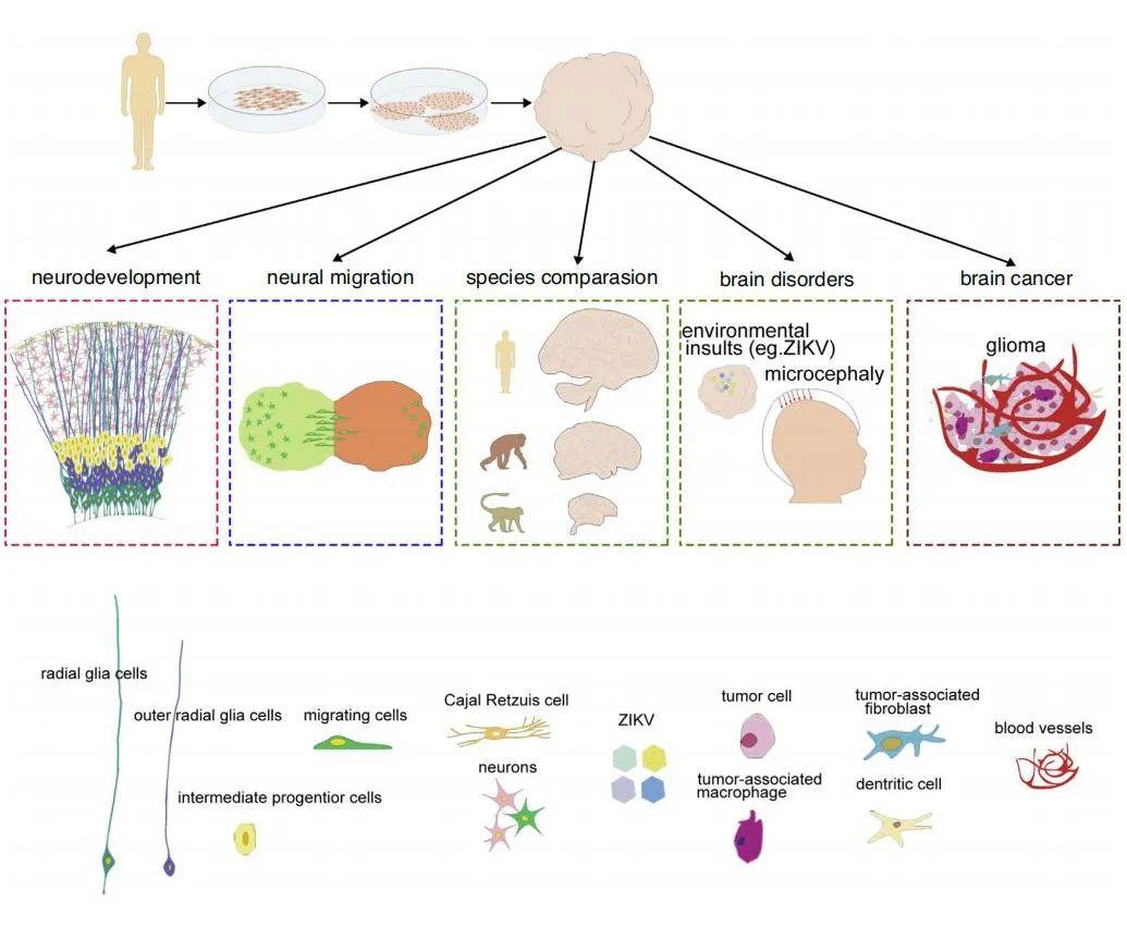 在过去的几年中,脑类器官系统已被广泛用于研究人类大脑疾病。由于脑类器官经历的培养与人类胎儿大脑的发育步骤相似,所以它们适用于模拟具有实际病因的神经发育障碍;同时,通过模拟脑类疾病的进展,可以实现药物的筛选。
