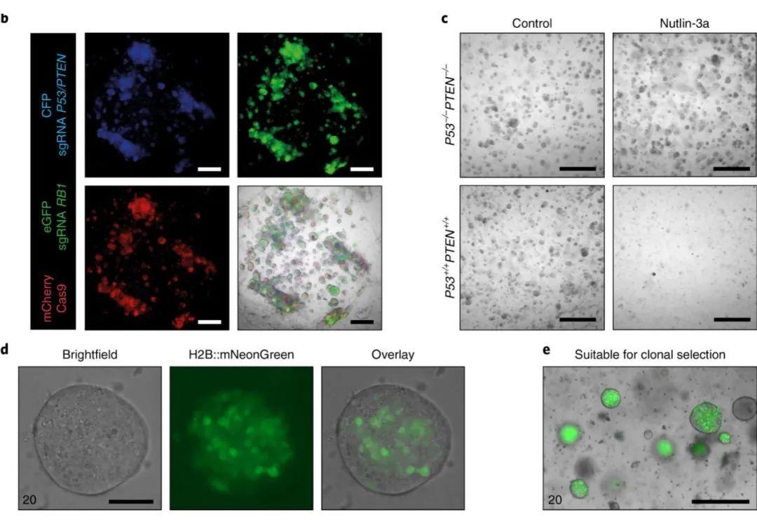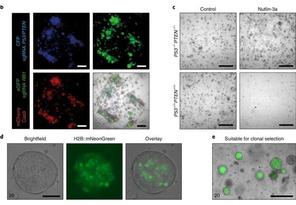 敲除P53/PTEN的正常乳腺组织类器官添加Nutlin-3a(10μM)处理7d将杀死所有表达野生型P53的细胞,并可用于选择P53敲除的类器官。而类器官选择和克隆培养,有助于优化小鼠原位类器官移植,无需手术即可移植类器官和雌激素颗粒,帮助治疗乳腺癌。