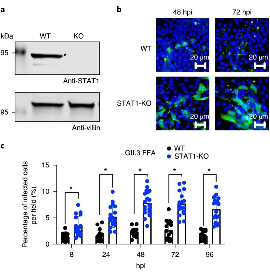 STAT1-KO HIE细胞更容易被GII.3(HuNoV毒株的一种)感染(Lin SC, et al. Nat Protoc. 2022 Apr;17(4):1004-1027.)
