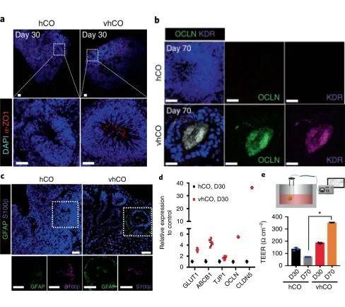 功能方面,通过跨内皮阻抗(TEER)分析表明,第30天及第70天时的vhCOs的TEER均显著性高于hCOs,且其在三维结构上TEER阻值十分接近于人血脑屏障TEER阻值。