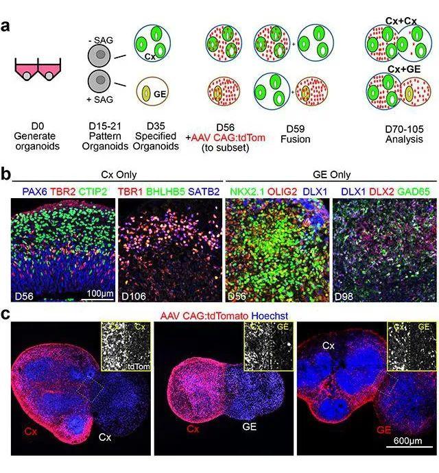 AAV1-CAG-tdTomato标记GE(神经节隆起)类器官,监测神经元迁移;AAV1-Syn-GCaMP6f-WPRE-SV40感染Cx(皮质)+GE类器官,激发钙活性[Cx和GE类器官由H9 hESC或是Rett hiPSCs细胞系产生]。